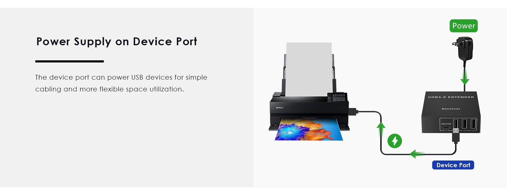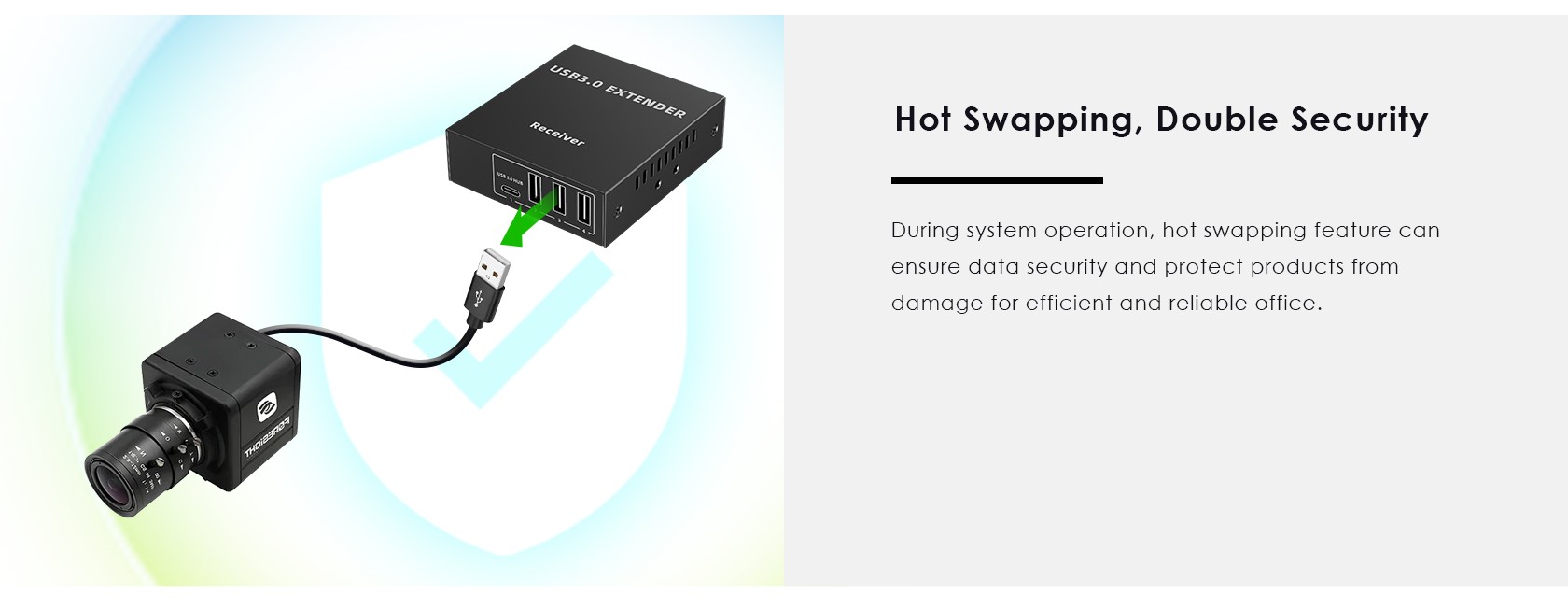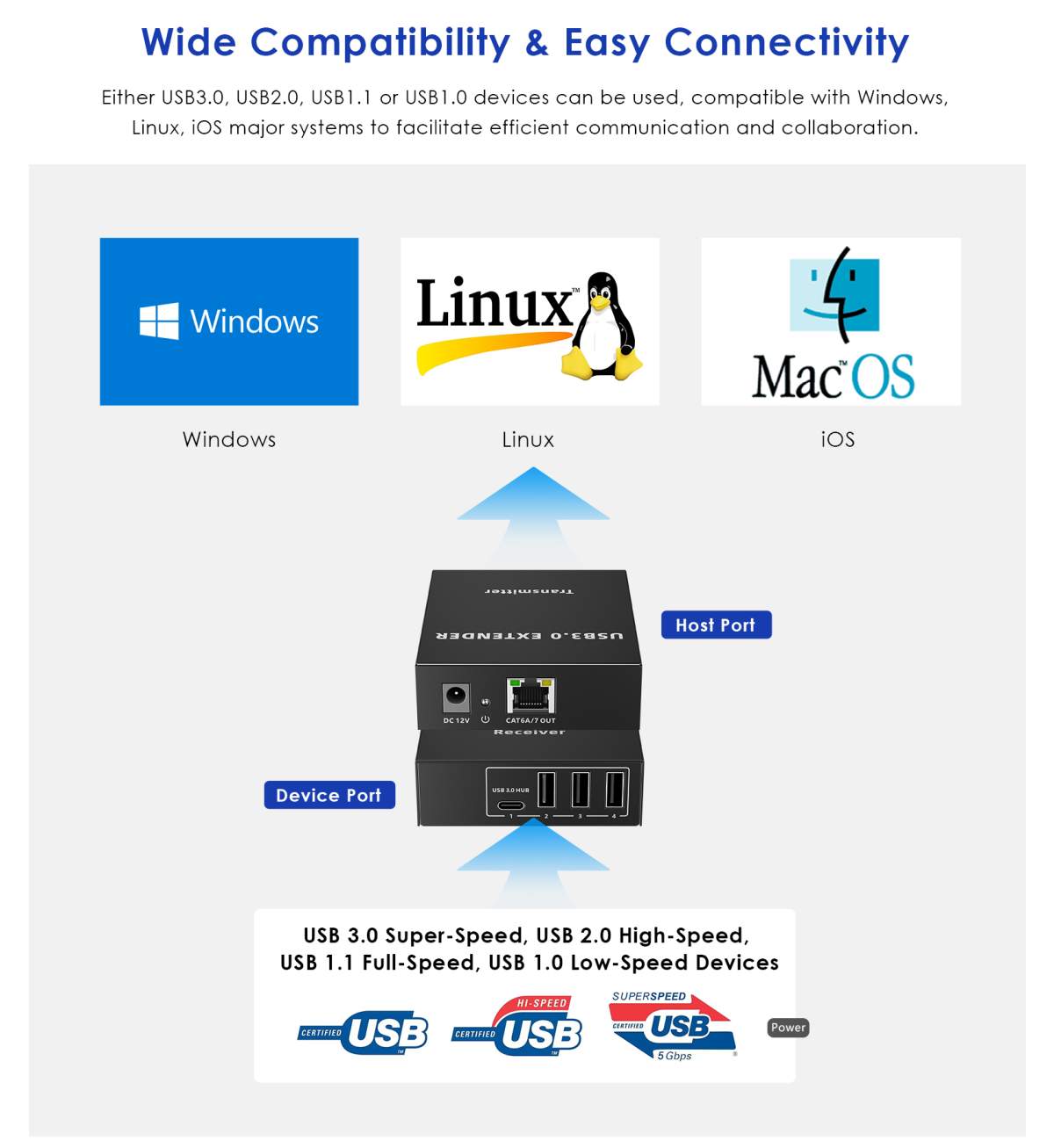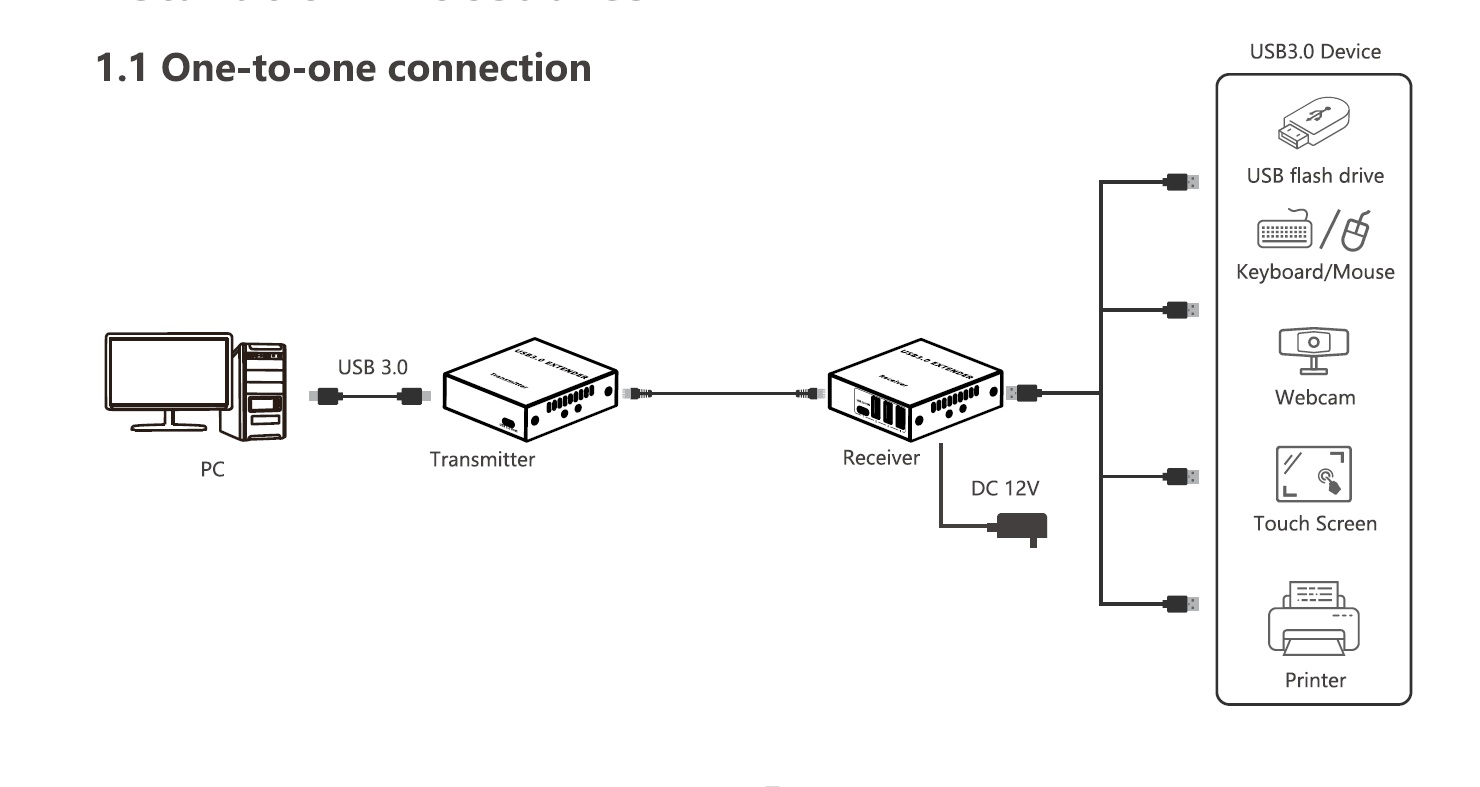 Tento extender překračuje omezení maximální vzdálenosti USB kabelu a umožňuje zapojit všechny USB periferie do vzdálenosti až 100m za pomoci kabelu Cat5e/Cat6/Cat6A.