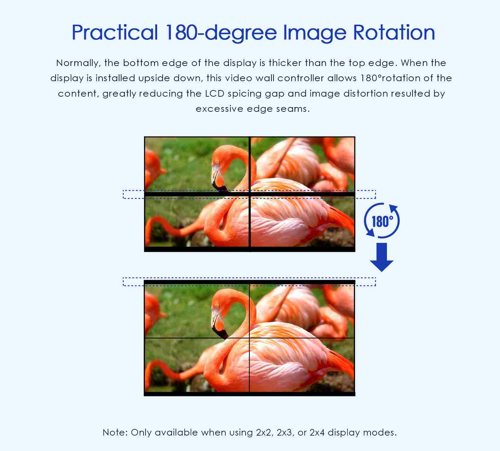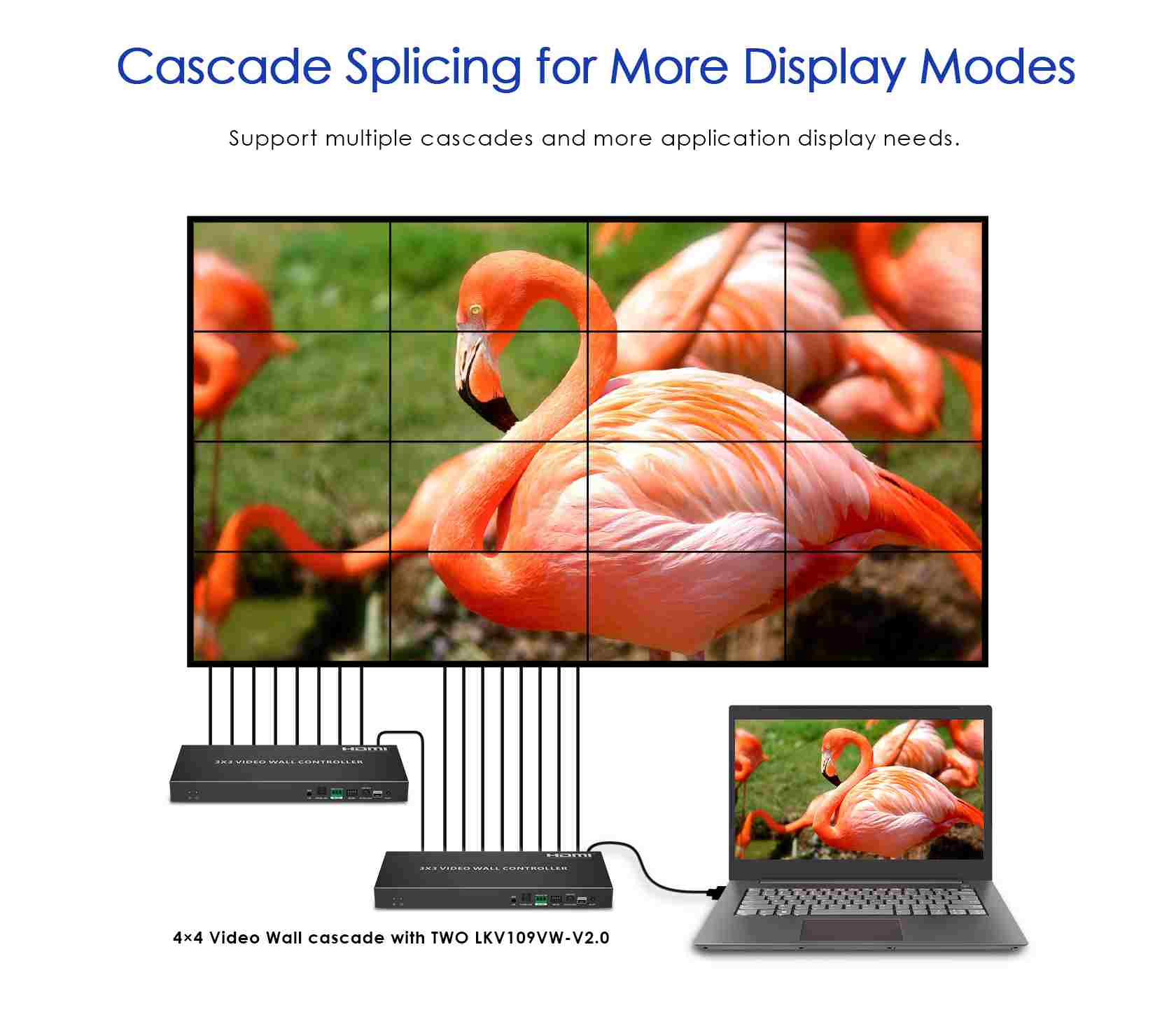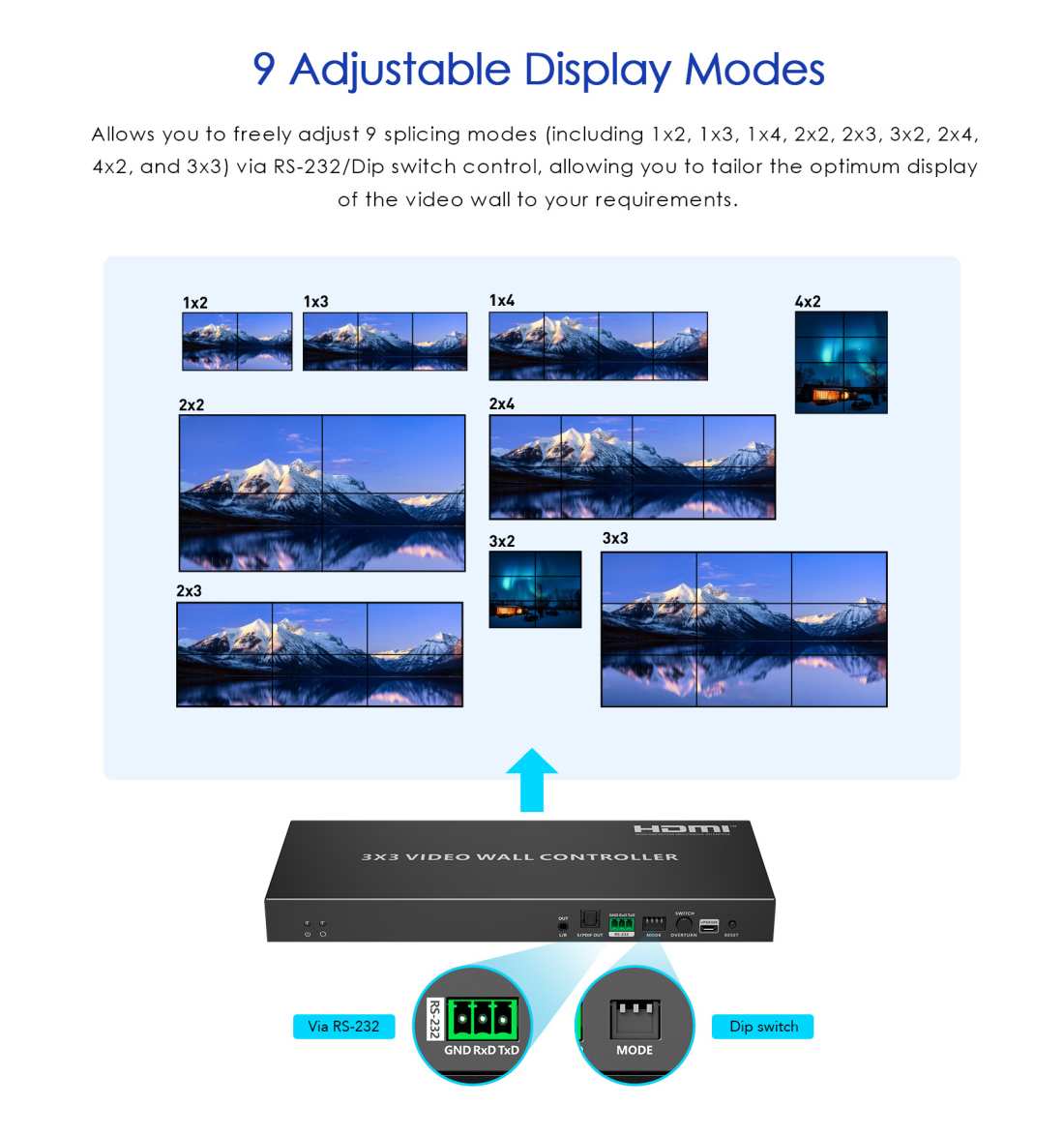 - Video Wall controller umožňuje zobrazit jeden HDMI obraz na až devět výstupů HDMI, na devět zobrazovačů nebo devět monitorů, které skládají jeden velký obraz