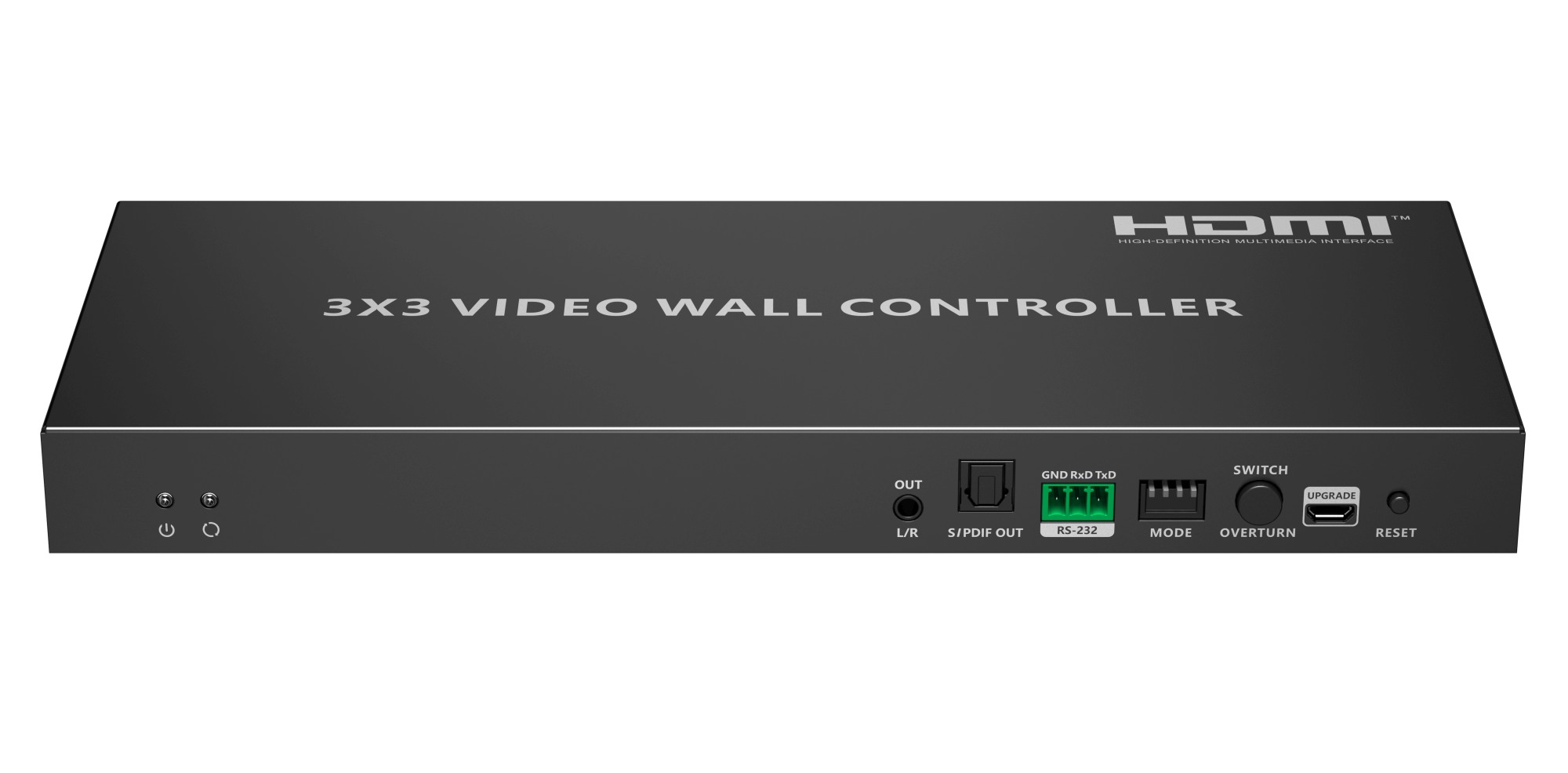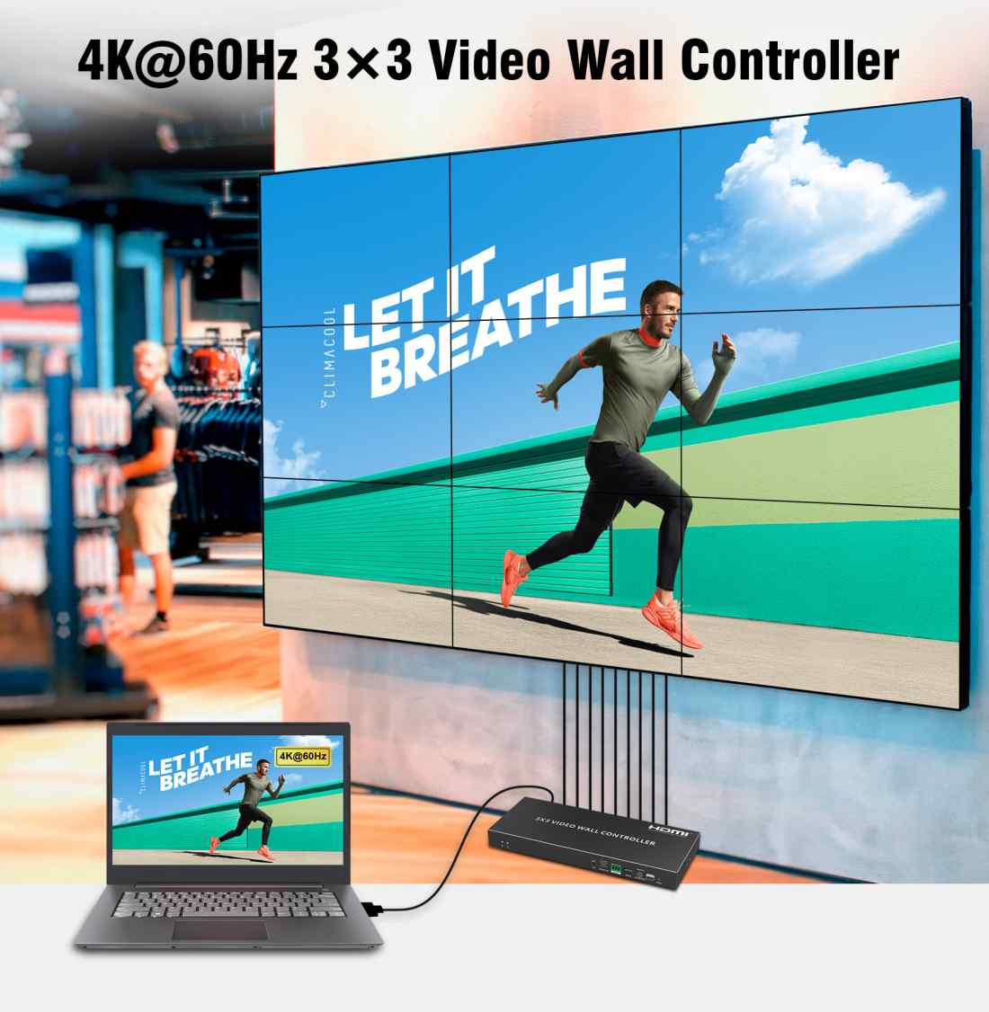 Video Wall controller rozloží HDMI obraz až na 9 monitorů. Složením devíti monitorů se složí jedna velká video stěna.Výsledné složení až devíti obrazů dává jeden velký obraz na velké video stěně.