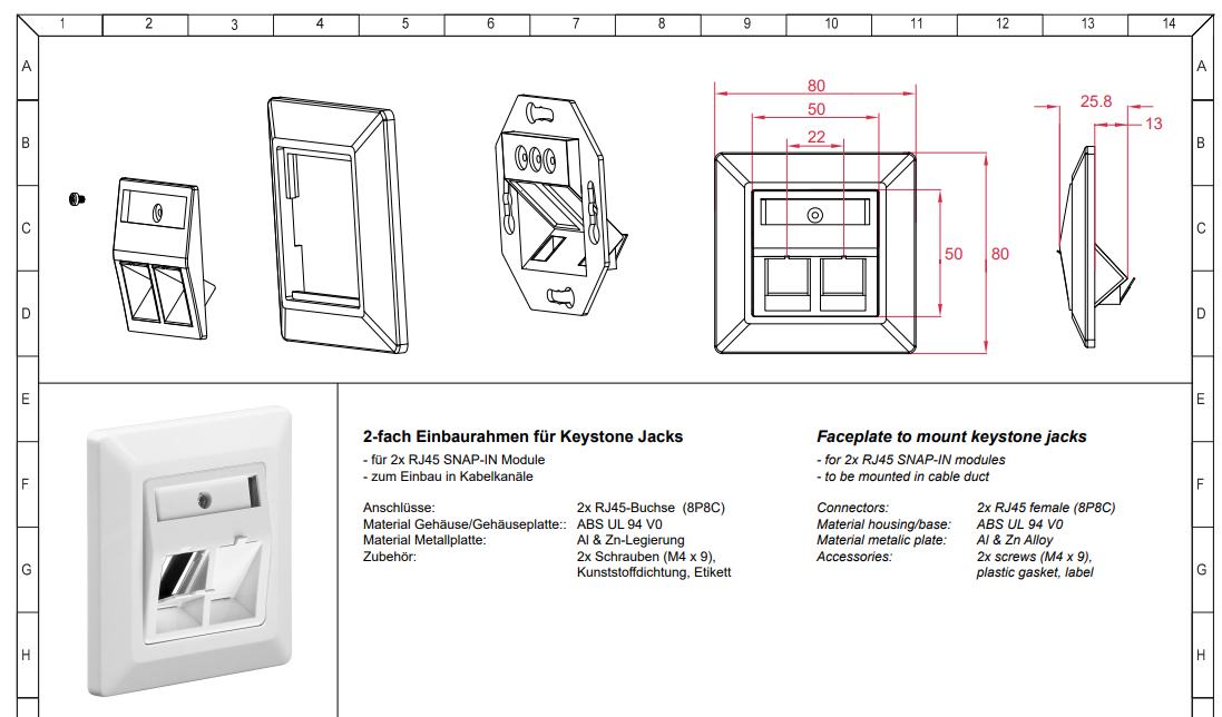 - 2 portová nástěnná krabice s bílým vnějším rámem o rozměrech 80 x 80 mm. Krabice pro povrchovou montáž není součástí dodávky (zásuvka je určena na montáž do krabice ve zdi).