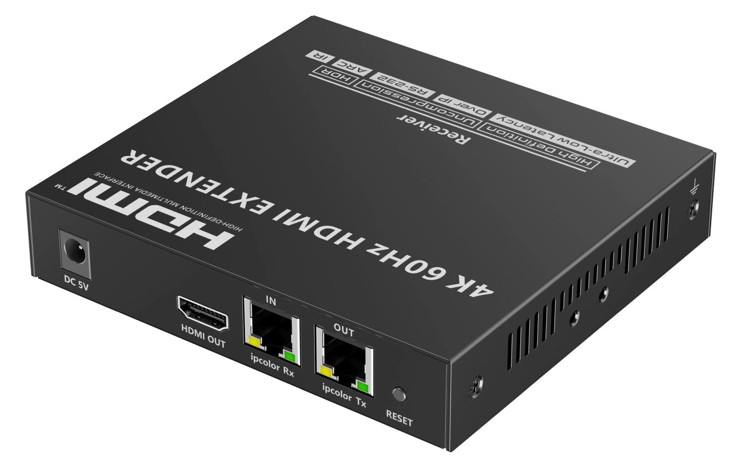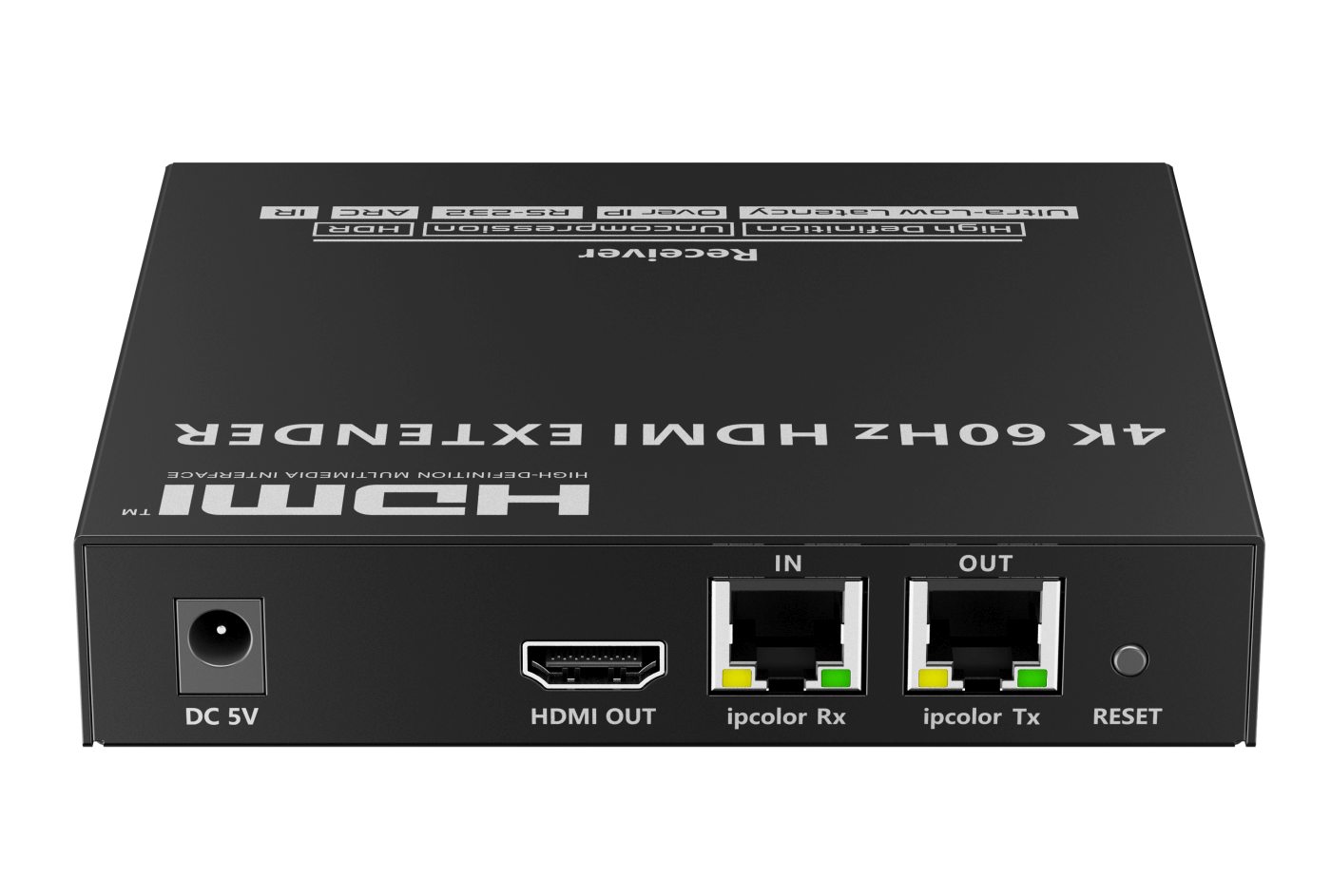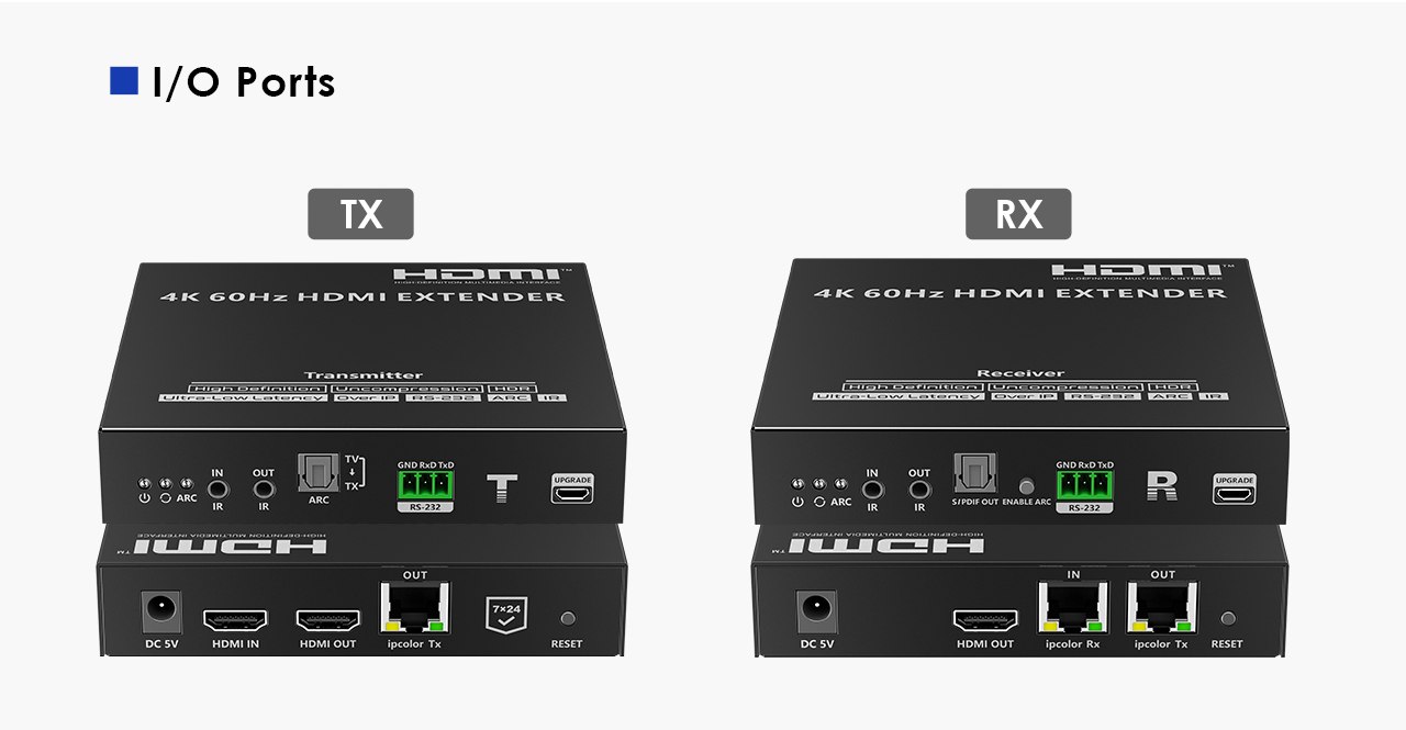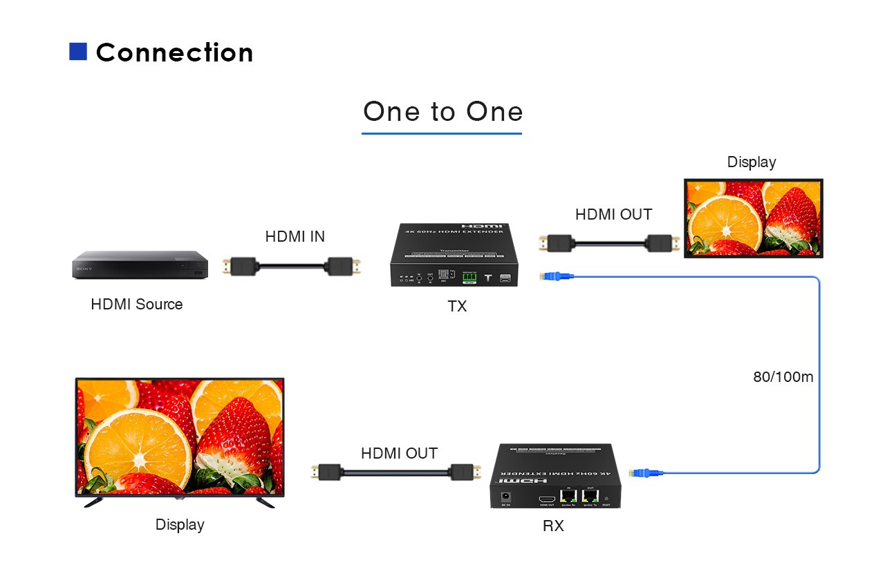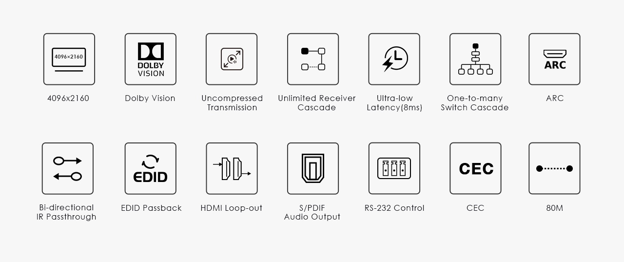 Zařízení umožňuje po jednom síťovém kabelu nebo prostřednictvím 10G LAN sítě přenést nekompreovaný 4K@60Hz HDMI signál s extrémně malým zpožděním a ve špičkové kvalitě až na 80m a současně IR signály, RS232 a digitální zvuk.
