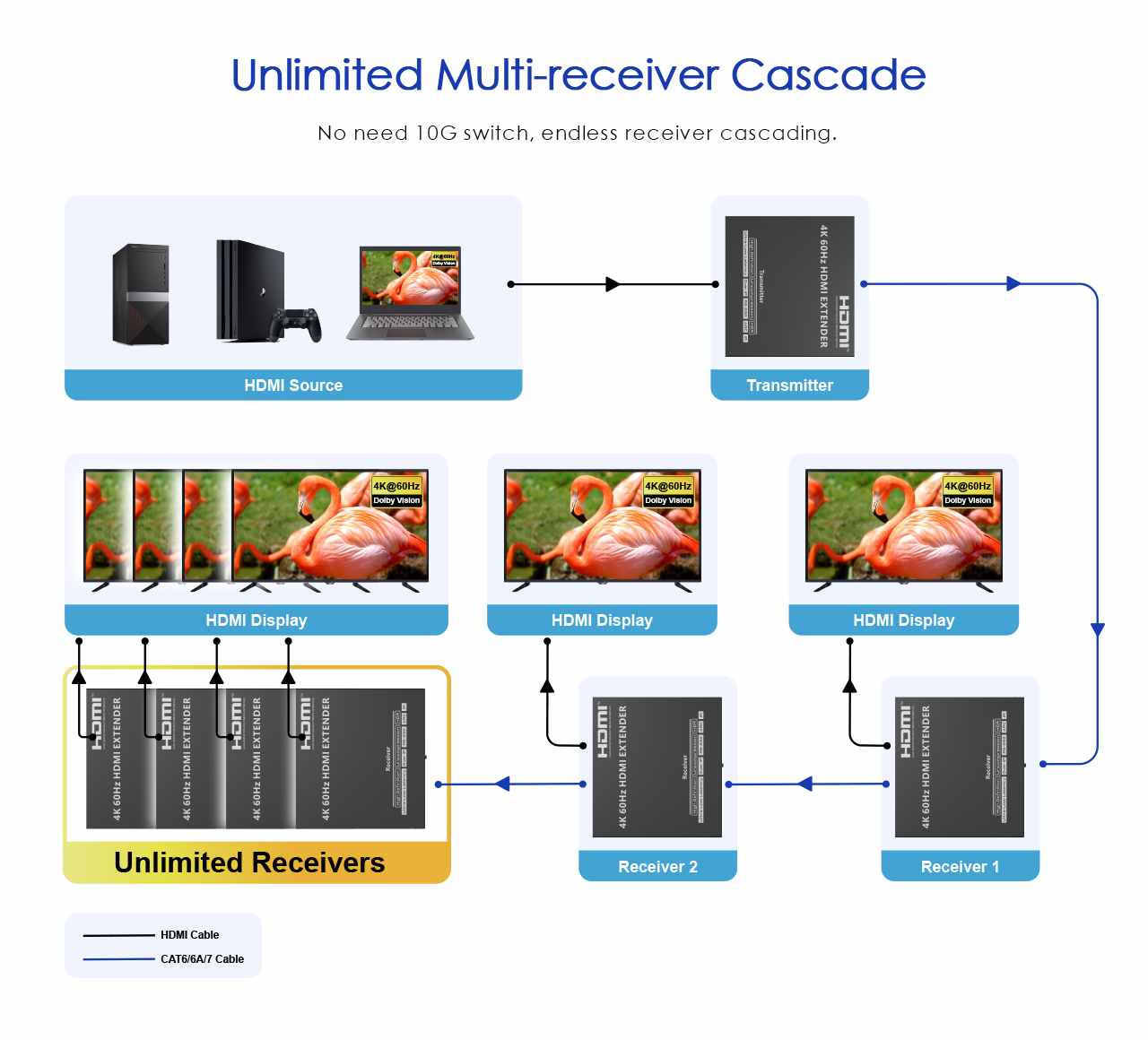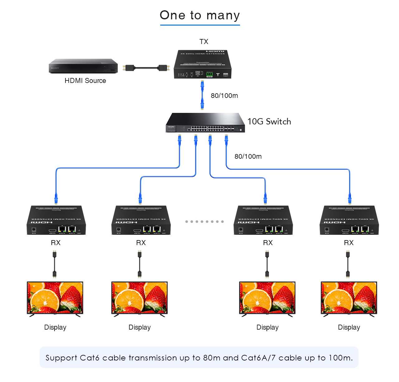 Signál je možné distribuovat na více monitorů pomocí LAN sítě, nejlépe 10 Gigabit sítě a 10 Gigabit switchů jak je znázorněno ve schematech zapojení. Zapojení je možné 1:1, do kaskády nebo pomocí 10G switchů jeden na mnoho přijímačů