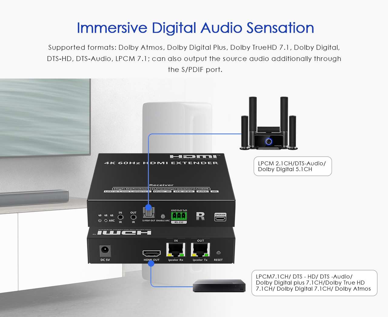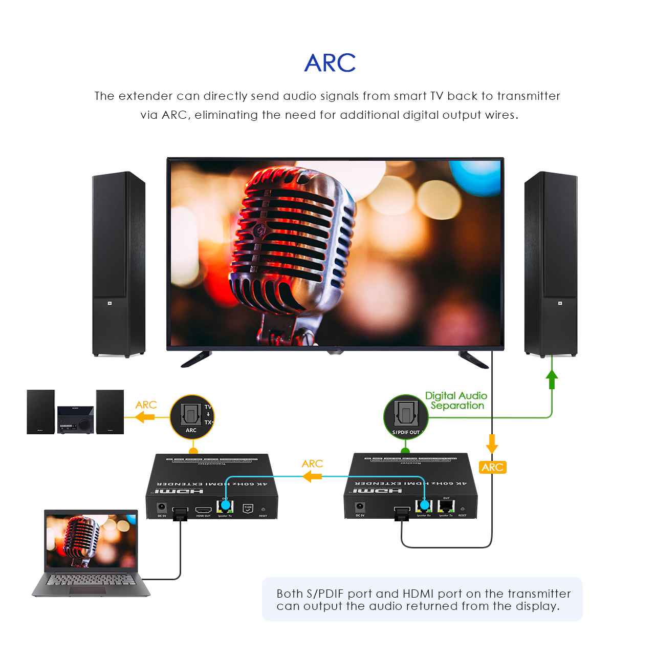 - Audio výstup S/PDIF podporuje funkci ARC , ARC funkce umožňuje nasměrovat zvuk zpět do vysílače extenderu z TV, jak je vysvětleno na přiloženém obrázku.