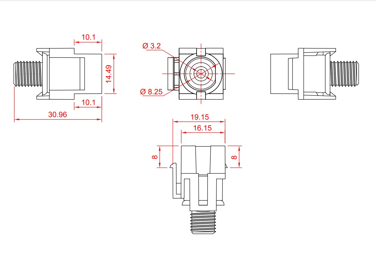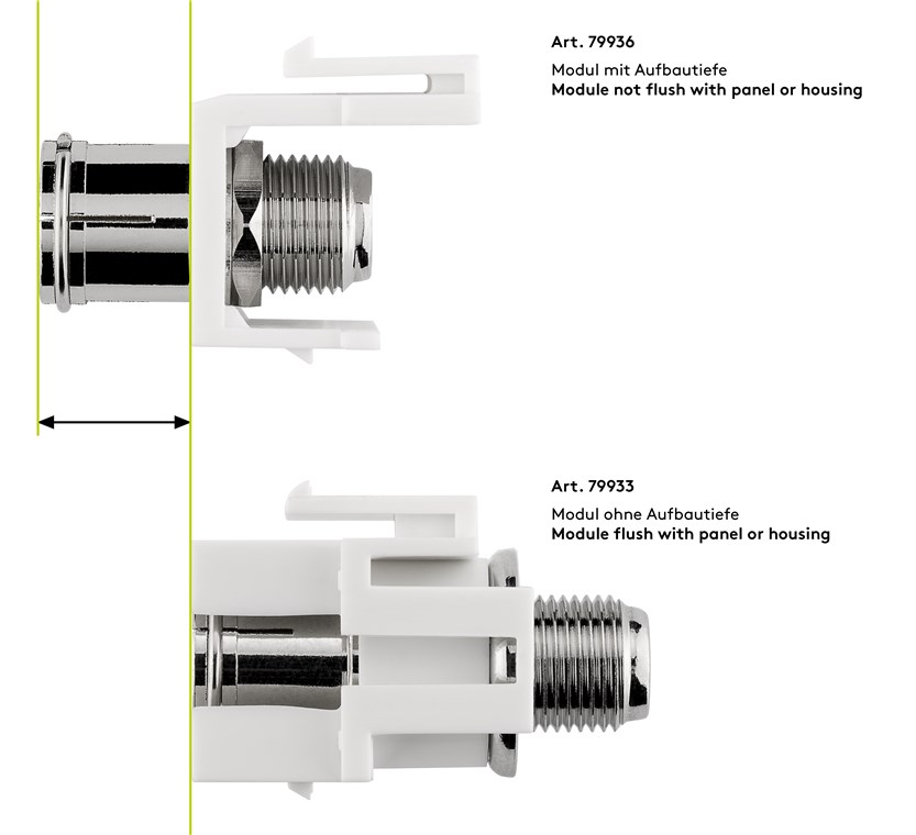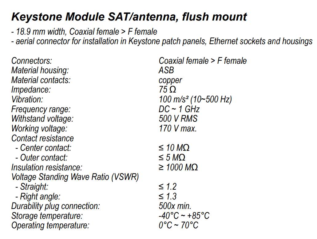 - Anténní konektor pro instalaci do Keystone panelů, zásuvek a krytů