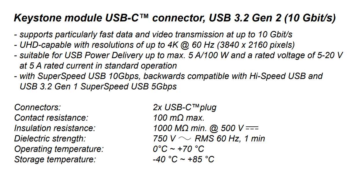 - Mimořádně univerzální, např. pro připojení 2x USB-C™ kabelů a rozšíření připojení nebo jako Keystone jack v rozvodném panelu, nástěnné zásuvce nebo stolní vložce