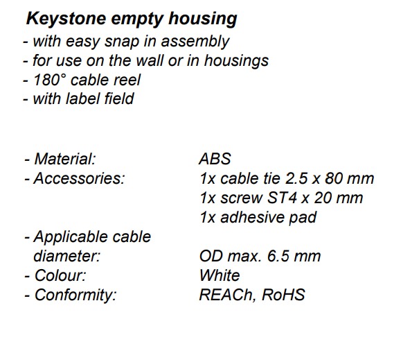 Držák/rámeček pro instalaci Keystone, např. s koaxiálními zásuvkami pro konektory IEC nebo F, zásuvkami RJ45 (CAT 5, CAT 6, CAT 6A), konektory reproduktorů (zásuvky RCA, šroubovací a svorkové konektory) a také zásuvkami USB, optickými vlákny a HDMI