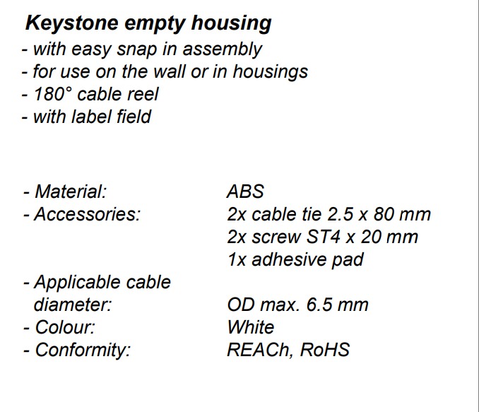 Držák/rámeček pro instalaci Keystone, např. s koaxiálními zásuvkami pro konektory IEC nebo F, zásuvkami RJ45 (CAT 5, CAT 6, CAT 6A), konektory reproduktorů (zásuvky RCA, šroubovací a svorkové konektory) a také zásuvkami USB, optickými vlákny a HDMI