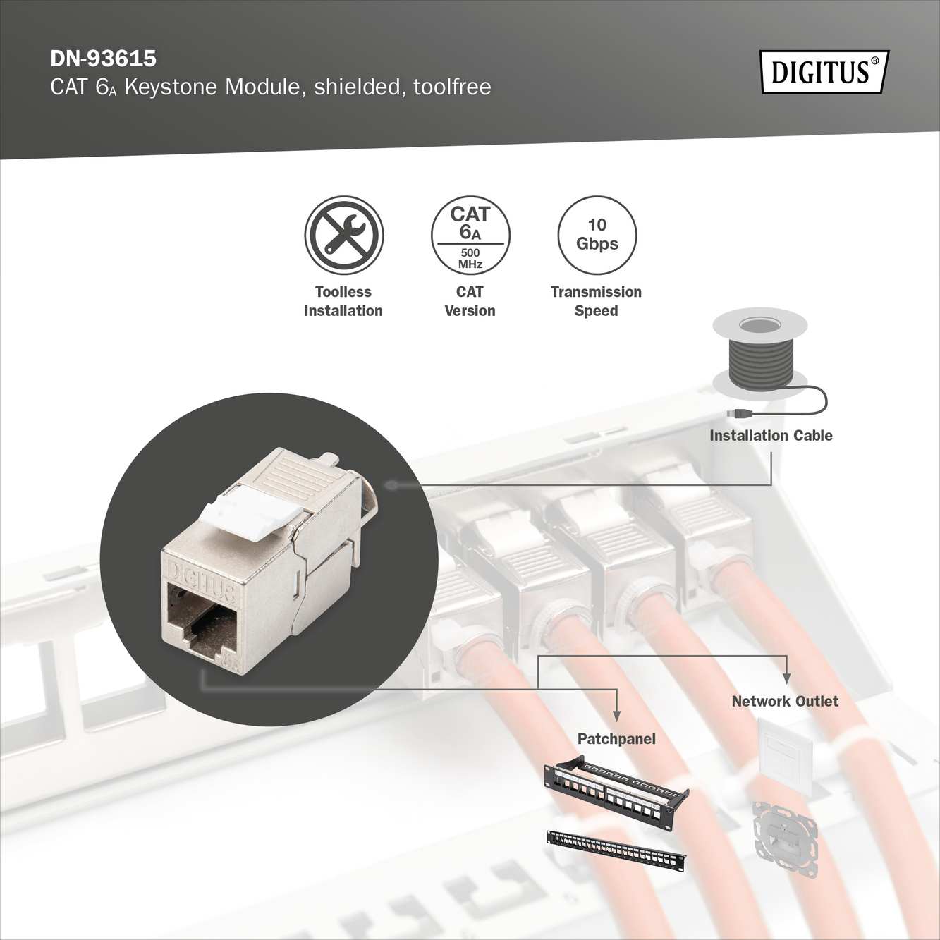 DIGITUS Keystone modul RJ45 CAT 6A, stíněný, beznástrojový, 500MHz