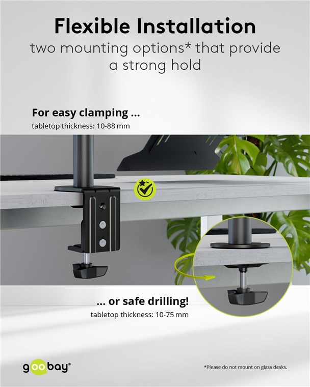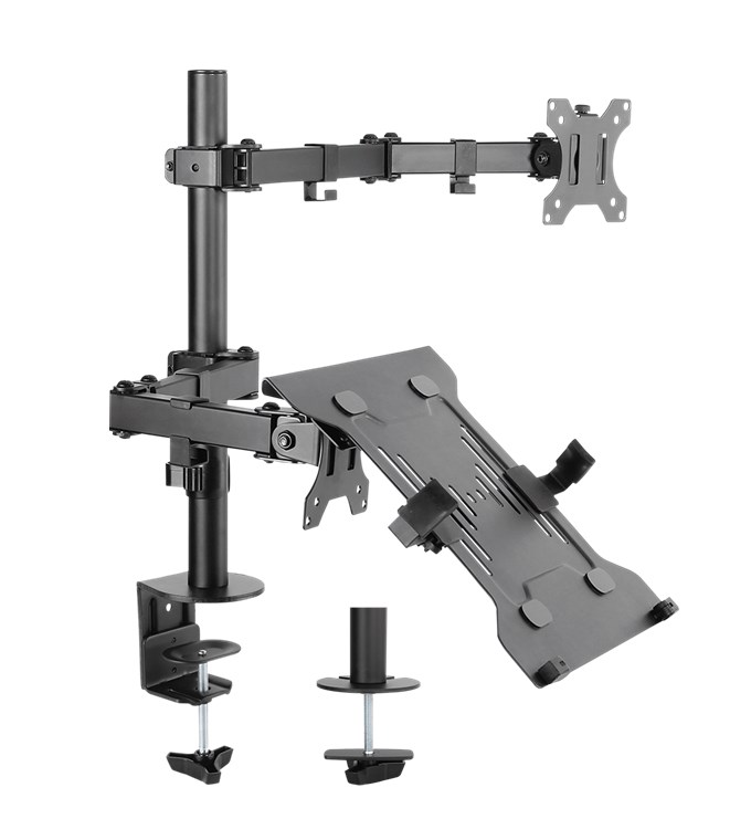 - Perfektní pro stabilní stolní montáž obrazovky do 8 kg a notebooku do 4,5 kg, výškově nastavitelné, ±90° otočné a ±45° naklápění, 180° rotace, doporučená tloušťka desky: 10-88 mm
