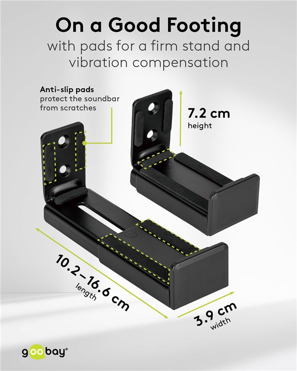 - Variabilně nastavitelné uchycení pro většinu běžných soundbarů až do hloubky 90-154 mm, kupř. od společností Samsung, LG, Sonos, Sennheiser, Teufel nebo JBL