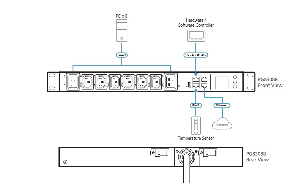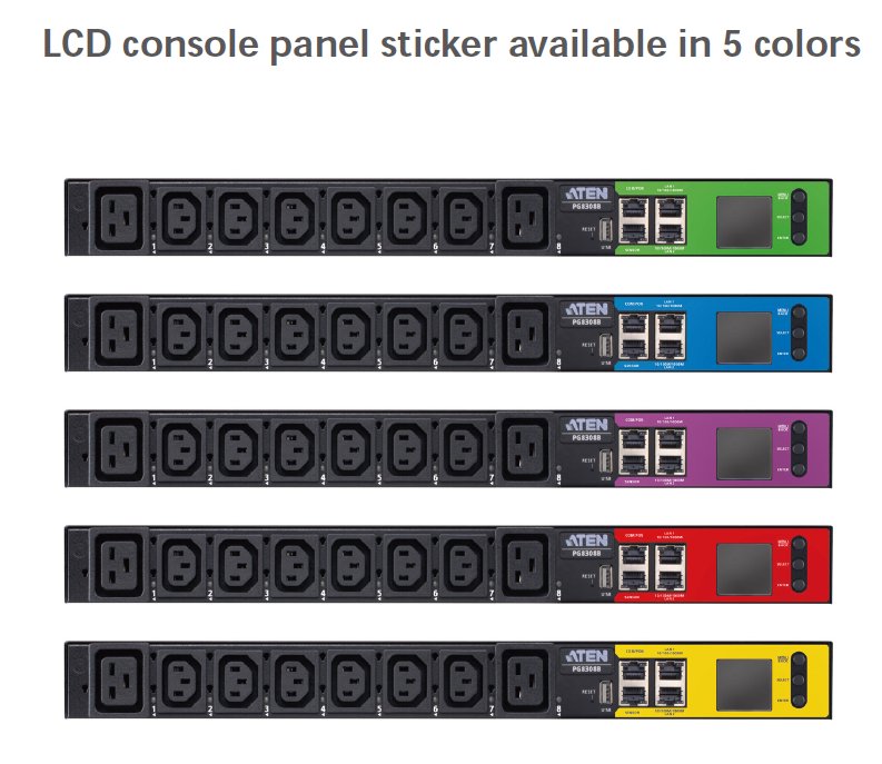 Řada inteligentních PDU společnosti ATEN řady PG zahrnuje PG8308G s měřením a přepínáním zásuvek. Každý PG8308 PDU má 8 zásuvek se 6 zásuvkami IEC60320 C13 a 2 zásuvkami IEC60320 C19, umístěné v kompaktní liště rozměrui 1U do 19" racku.