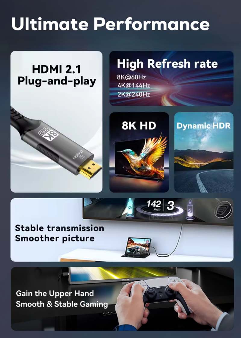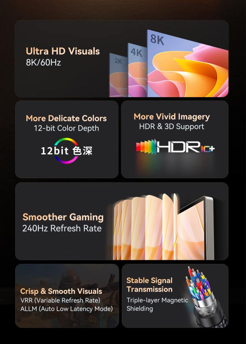 - Rozlišení:8K@60Hz (7680*4320), 4K@144Hz (3840*2160), 2K@165Hz/240Hz