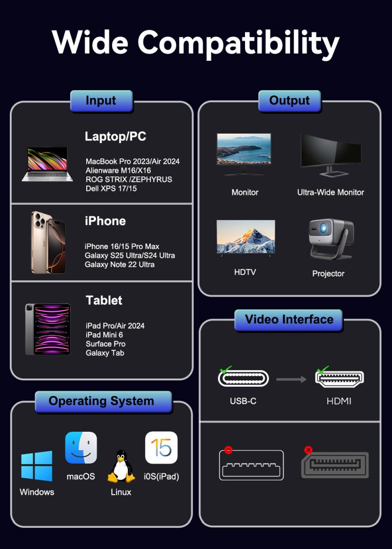 - Může fungovat na nových Macbookech, Chromebookech, Asus Zen AIO a dalších zařízeních vybavených typem C z roku 2015.