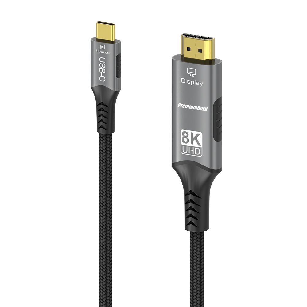 PremiumCord Adaptér USB-C na HDMI rozlišení obrazu 8K@60Hz,4K@144Hz Aluminium, 20cm, adaptér umožňuje vysoce kvalitní převod videa a zvuku z USB-C na HDMI konektor pro monitor/TV/projektor. Funguje jako externí grafická karta s výstupem HDMI.