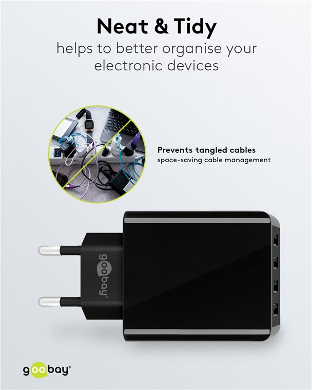 - Velkorysé 4x USB porty snižují vaše požadavky na pouhý jeden zásuvkový adaptér – výsledkem je méně nepořádku nabíječky
