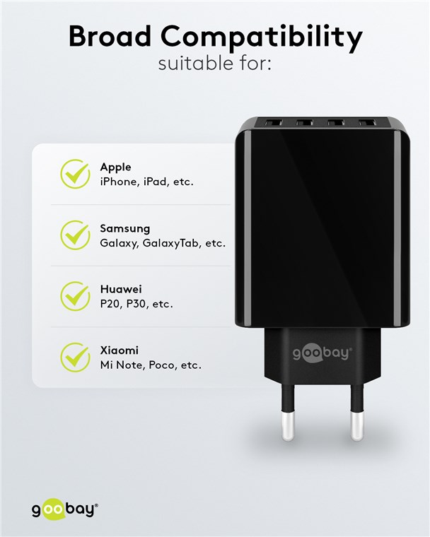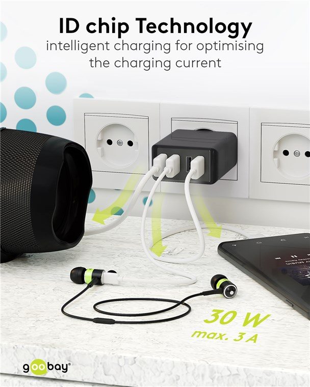 - S výkonem 30 W je nabíjecí adaptér speciálně přizpůsoben pro malá zařízení, jako jsou smartphony, Bluetooth sluchátka, tablety nebo powerbanky.