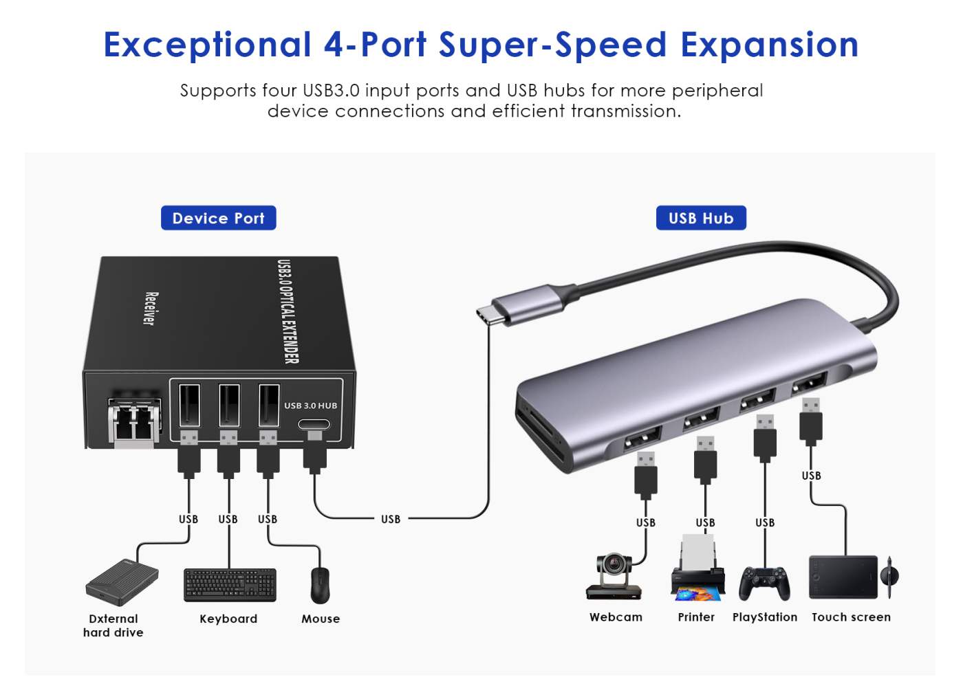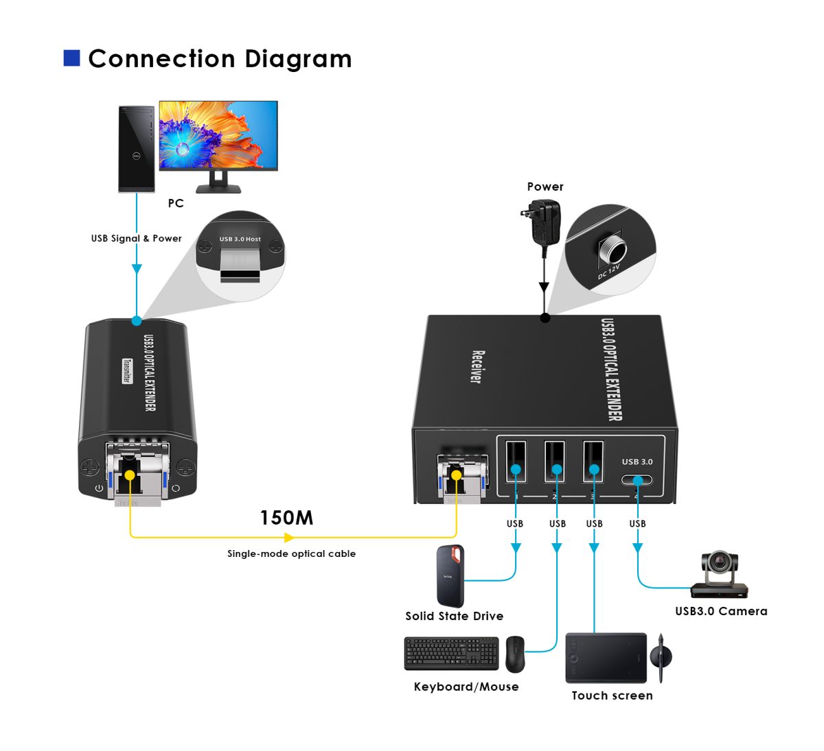 Tento extender překračuje omezení maximální vzdálenosti USB kabelu a umožňuje zapojit všechny USB periferie do vzdálenosti až 150m za pomoci single-mode optického kabelu