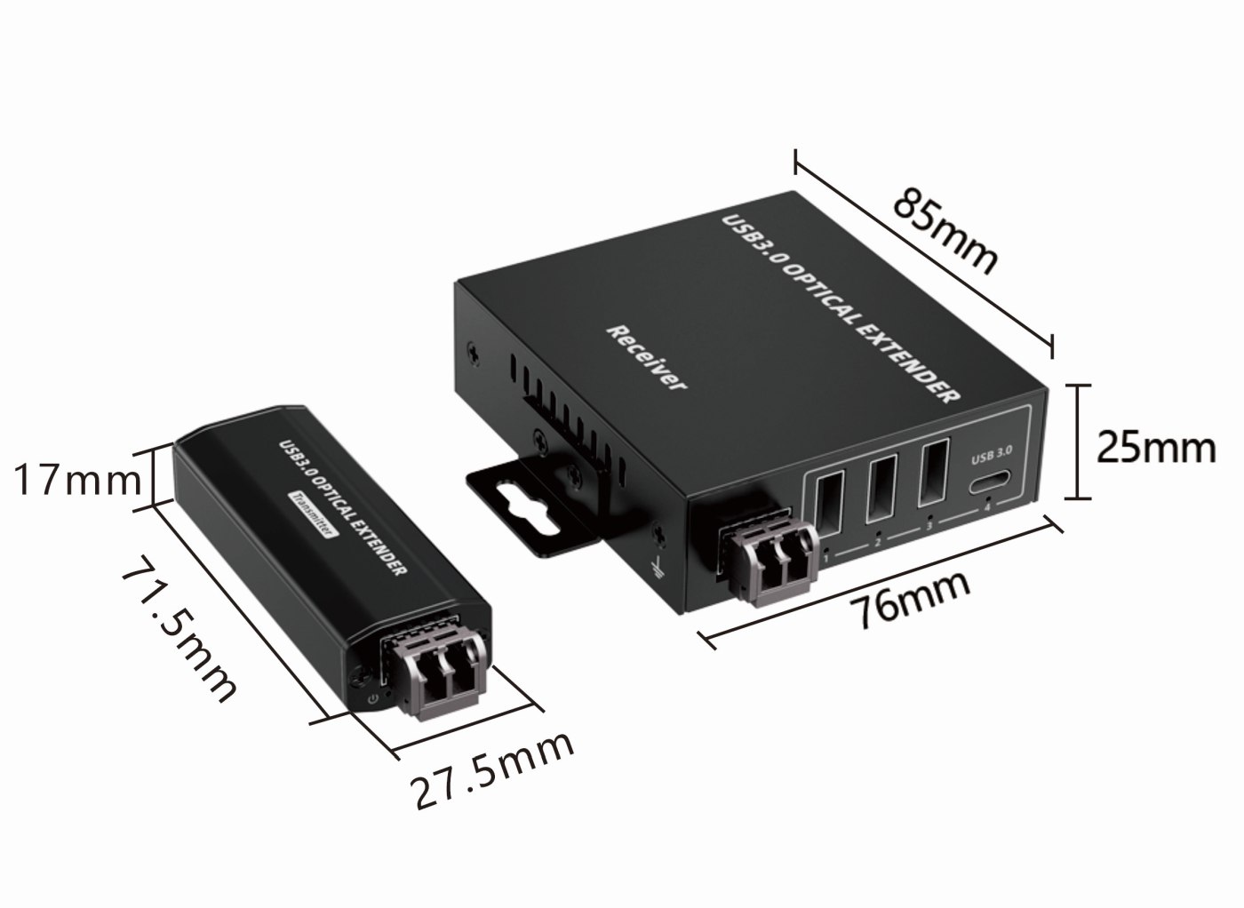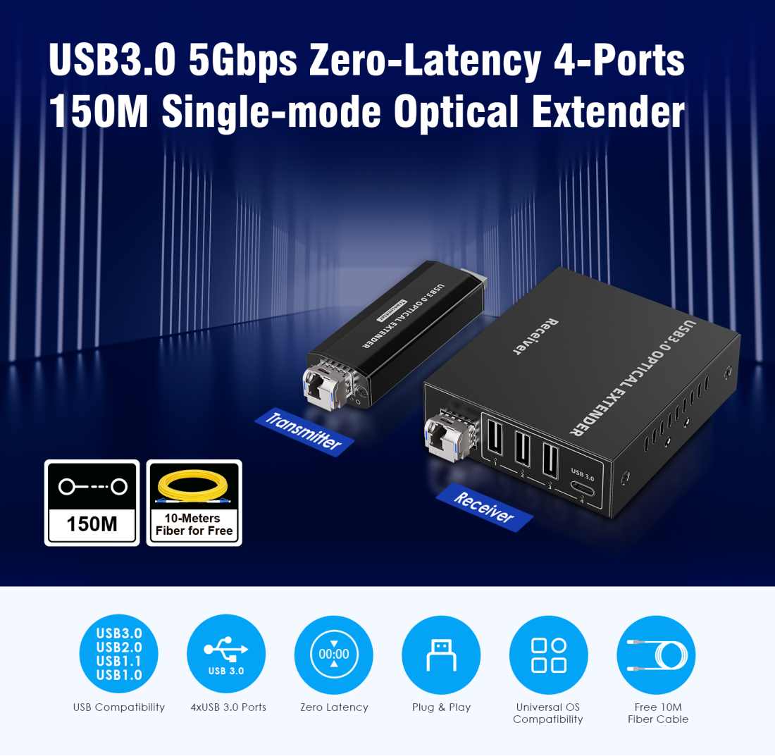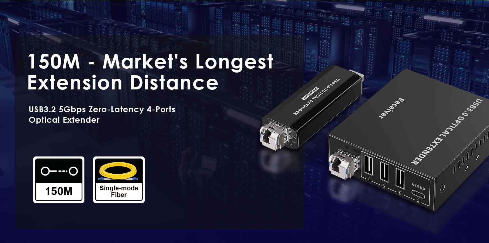 - Vysílá USB signál přes multi-mode optický kabel až na vzdálenost 150m.