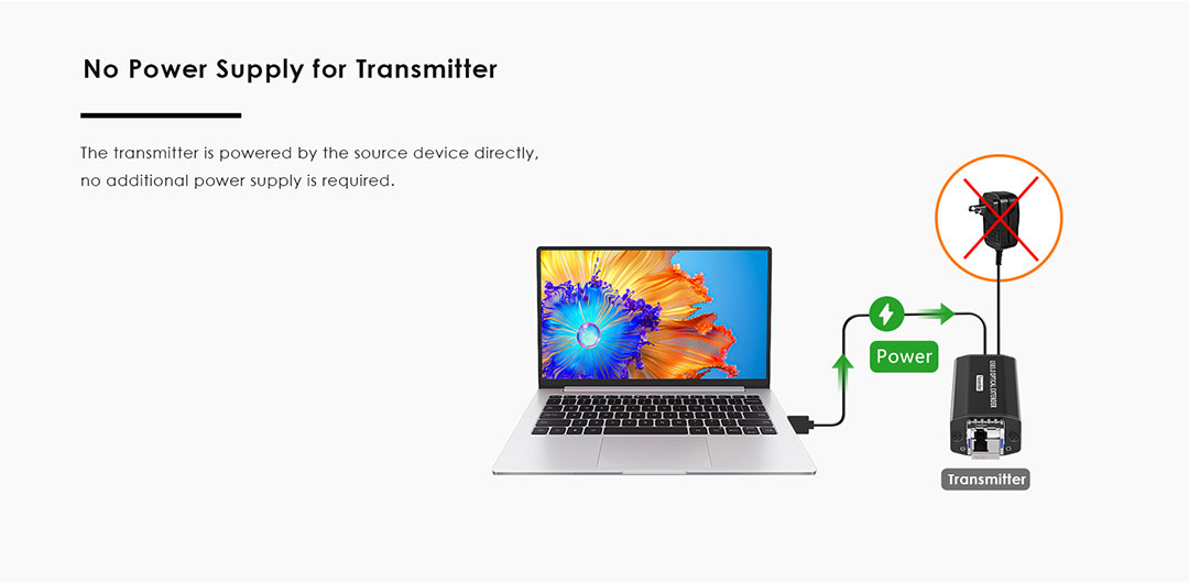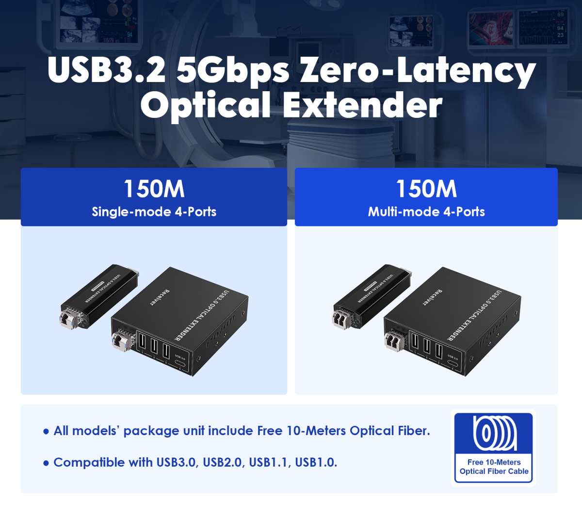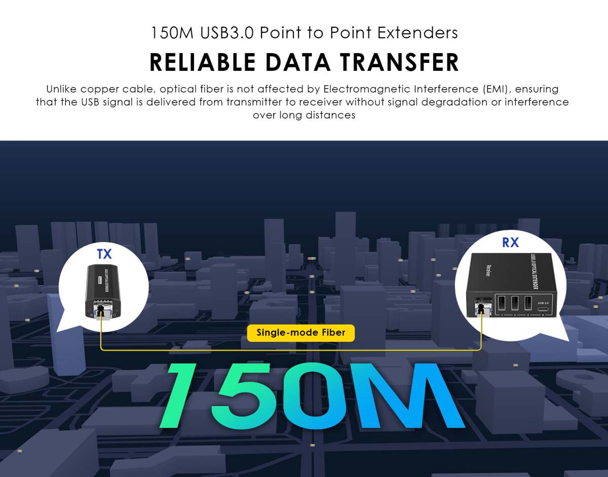 - Vysílá USB signál přes multi-mode optický kabel až na vzdálenost 150m.