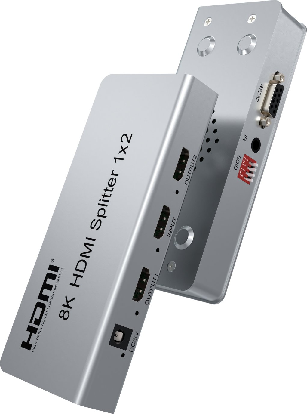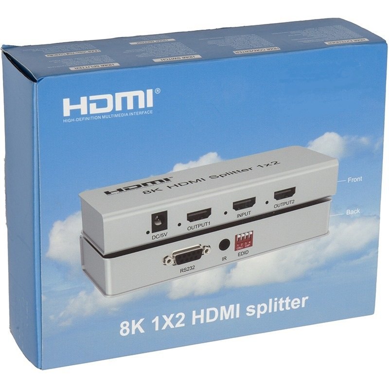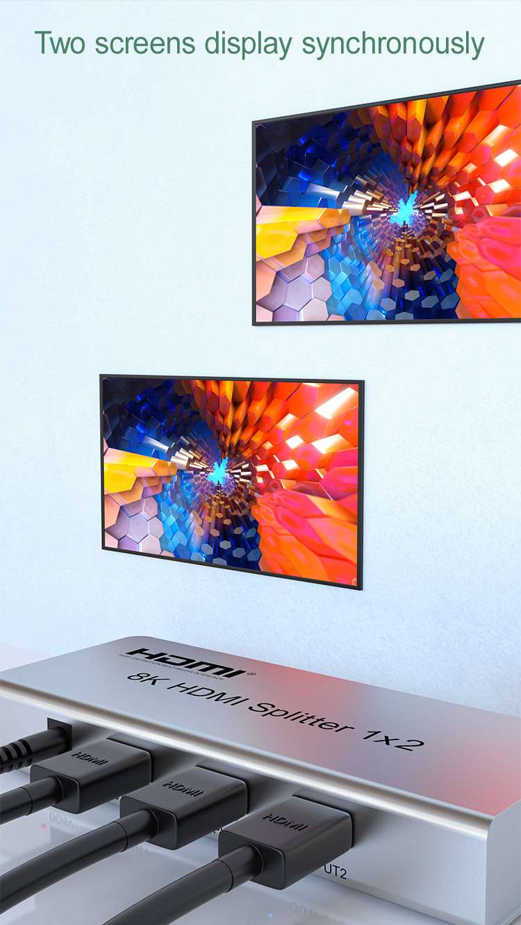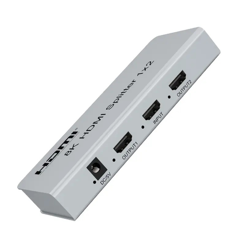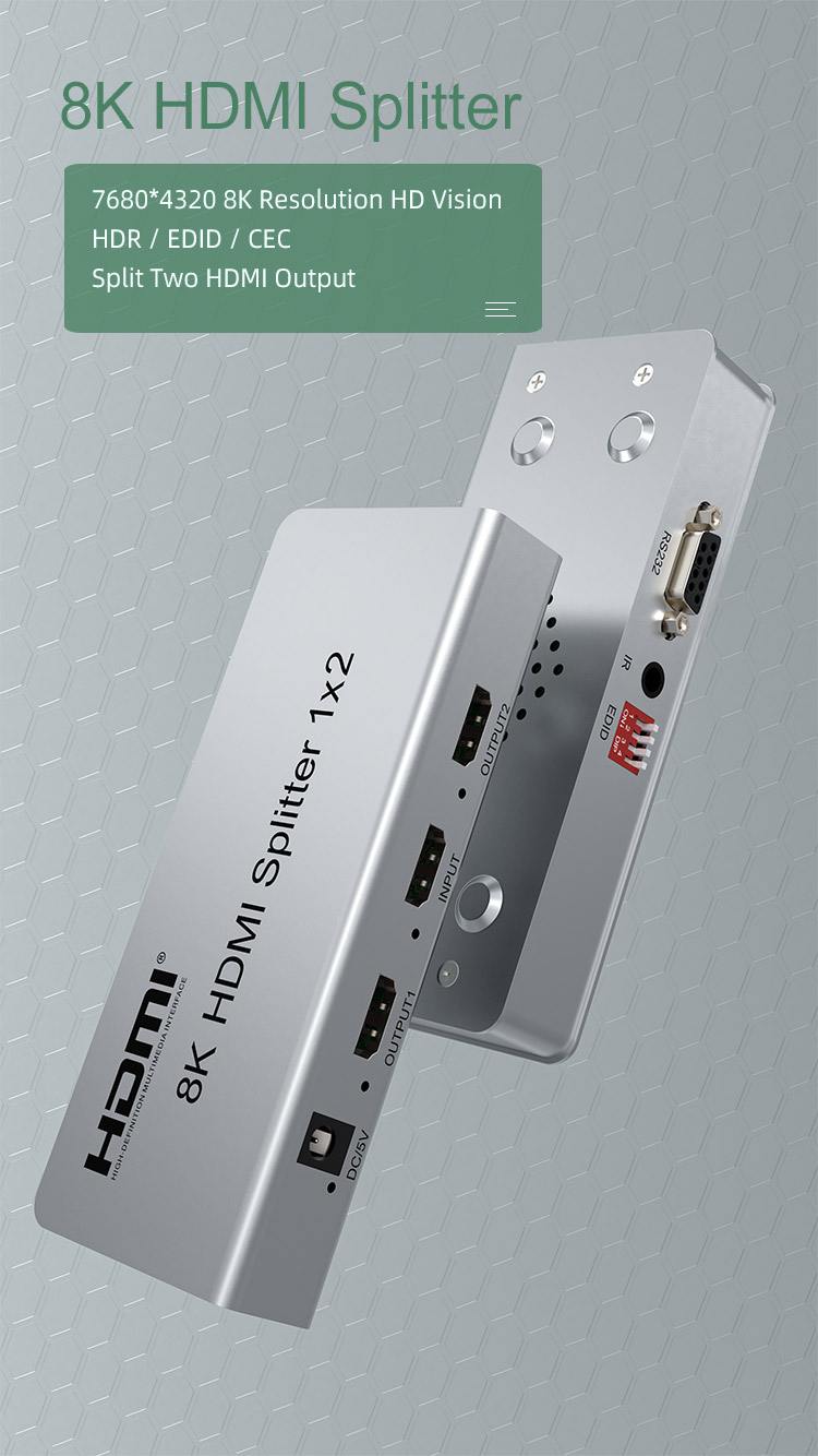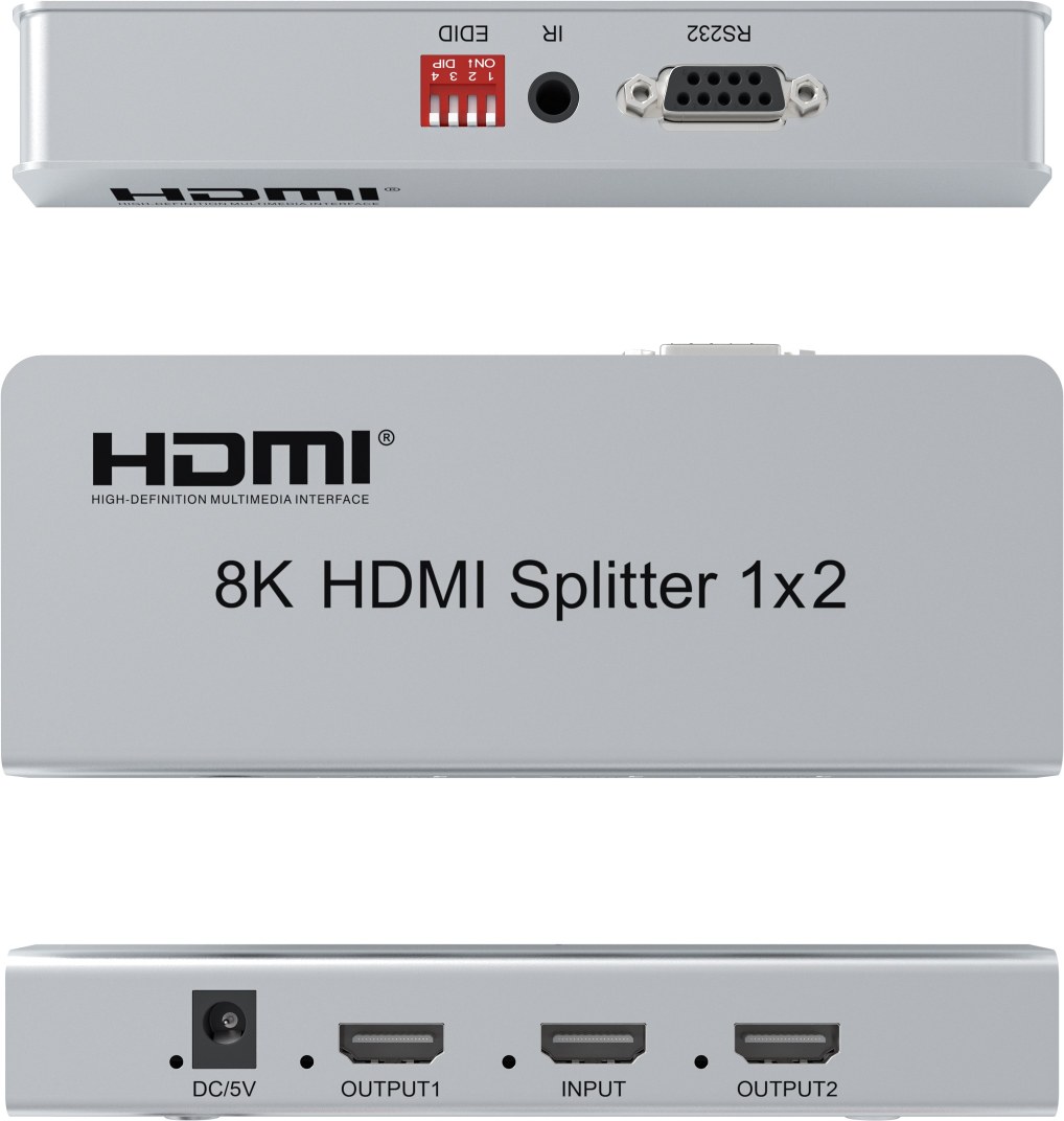 HDMI 2.1 splitter 1-8 portů, 8K@60Hz, 4K@120Hz, 1080p, HDR, zapojí čtyři HDMI obrazovky k jednomu HDMI zdroji signálu jako je PC, notebook, DVD, set top box, umožňuje připojit na výstupu monitory s rozlišením 8K, 4K nebo 1080p