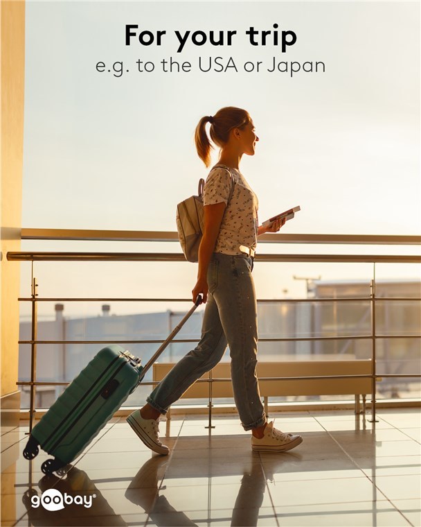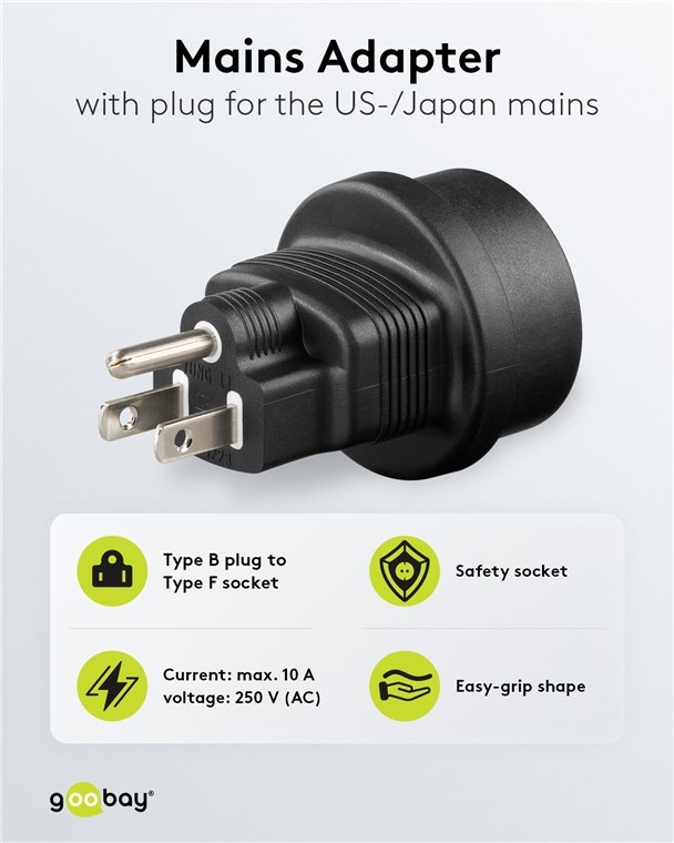 - Praktická cestovní zástrčka pro připojení elektrických spotřebičů s bezpečnostní zástrčkou (typ F) k zásuvkám v USA nebo Japonsku (typ B)