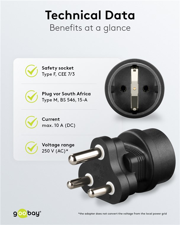 - Ideální jako cestovní adaptér v mnoha zemích světa, např. v Lesothu, Svazijsku, Namibii, Indii, na Srí Lance a v Nepálu