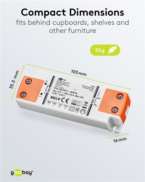 - Kompaktní LED transformátor bez minimálního zatížení pro připojení světelných zdrojů, jako jsou LED pásky nebo LED moduly, k síti 200–240 V (AC)