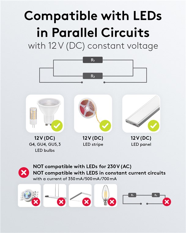 - Vhodné pro paralelní obvody a vnitřní použití (IP20), s bezpečnou elektronickou izolací dle třídy spotřebičů II, ochrana proti přepětí a zkratu