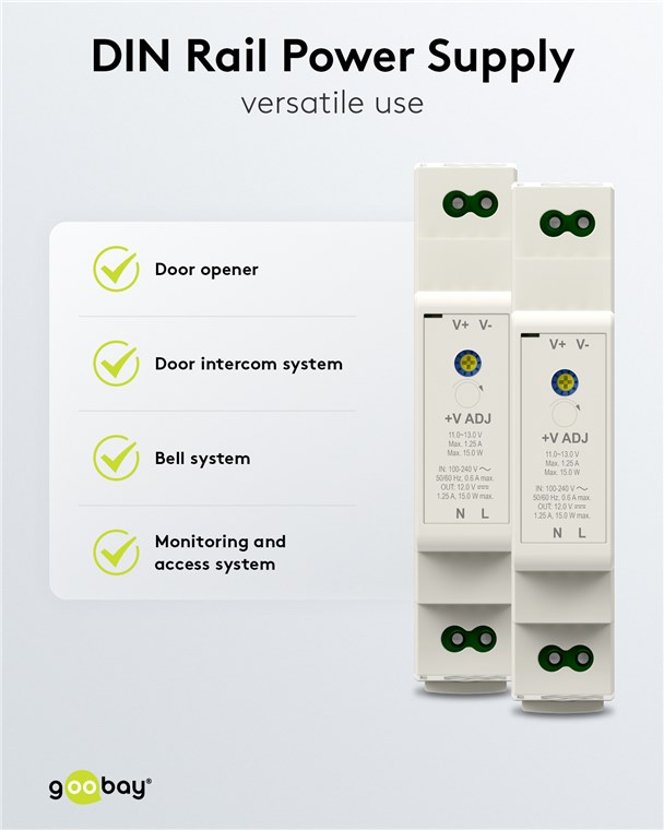 goobay napájecí zdroj do DIN lišty 12 V (DC), max.proud 2.5 A, výkon 30 W, napájecí zdroj na DIN lištu je ideálním řešením pro zařízení se na stabilním zdrojem konstantního stejnosměrného napětí, např. zvonky, přístupové systémy nebo senzory.
