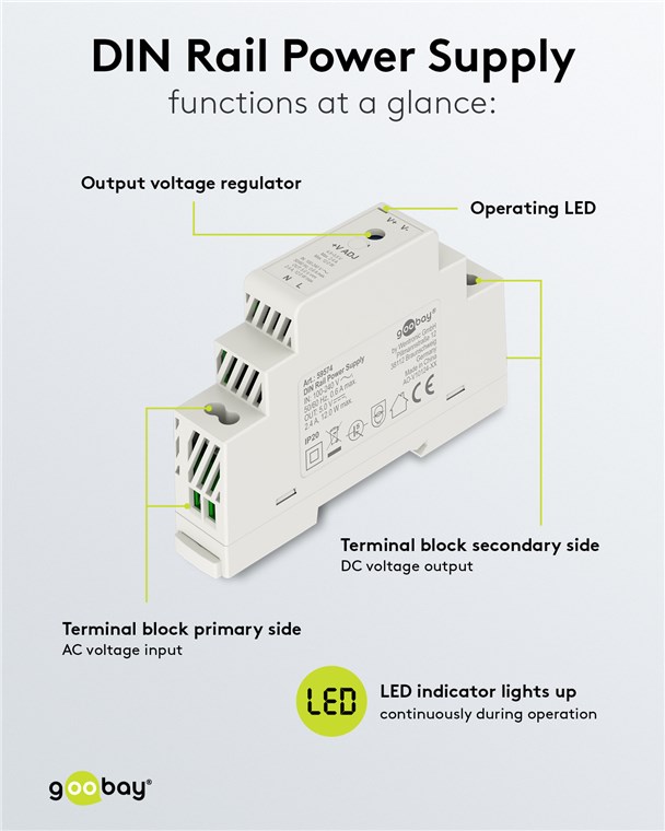goobay napájecí zdroj do DIN lišty 12 V (DC), max.proud 2.5 A, výkon 30 W, napájecí zdroj na DIN lištu je ideálním řešením pro zařízení se na stabilním zdrojem konstantního stejnosměrného napětí, např. zvonky, přístupové systémy nebo senzory.