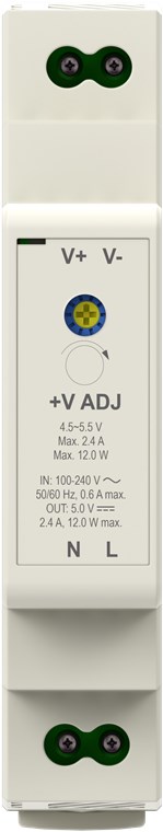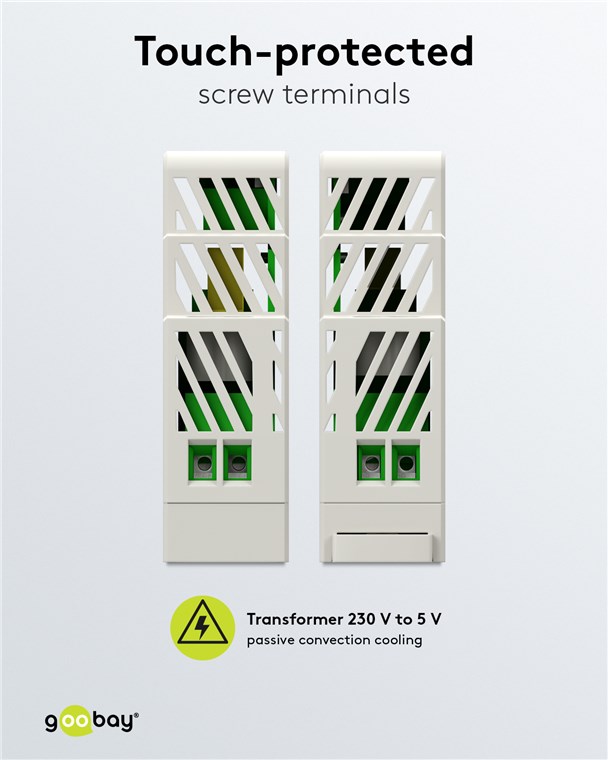 - Transformátor z 240 V AC na 5 V DC s pasivním konvekčním chlazením se připojuje pomocí šroubových svorek chráněných proti dotyku.