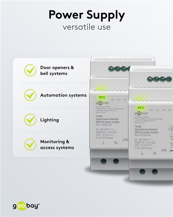 goobay napájecí zdroj do DIN lišty 12 V (DC), max.proud 2.5 A, výkon 30 W, napájecí zdroj na DIN lištu je ideálním řešením pro zařízení se na stabilním zdrojem konstantního stejnosměrného napětí, např. zvonky, přístupové systémy nebo senzory.