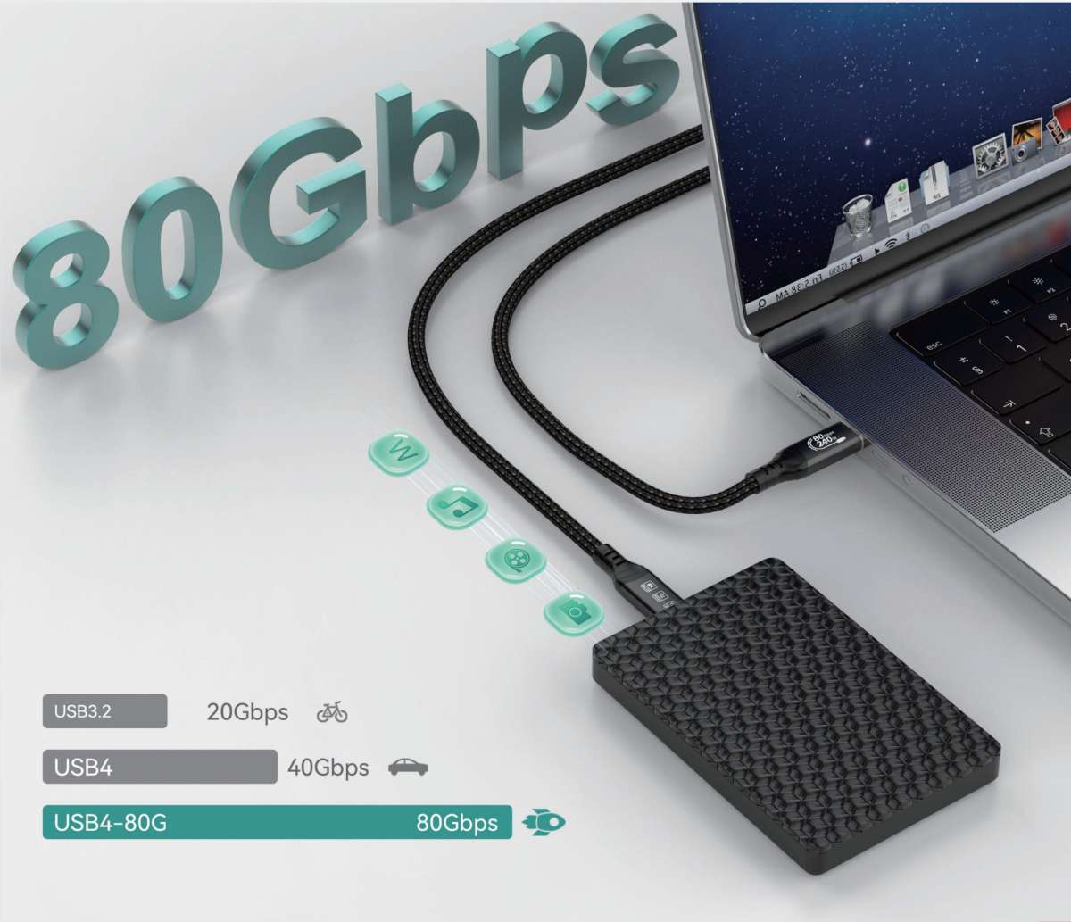 - Bezkonkurenčních 80 Gbit/s zajišťuje bleskově rychlý přenos dat – kabel USB-C je 16x rychlejší než USB 3.0 a ideální pro pevné disky NVMe, HD filmy, seriály, hudbu a fotografie.