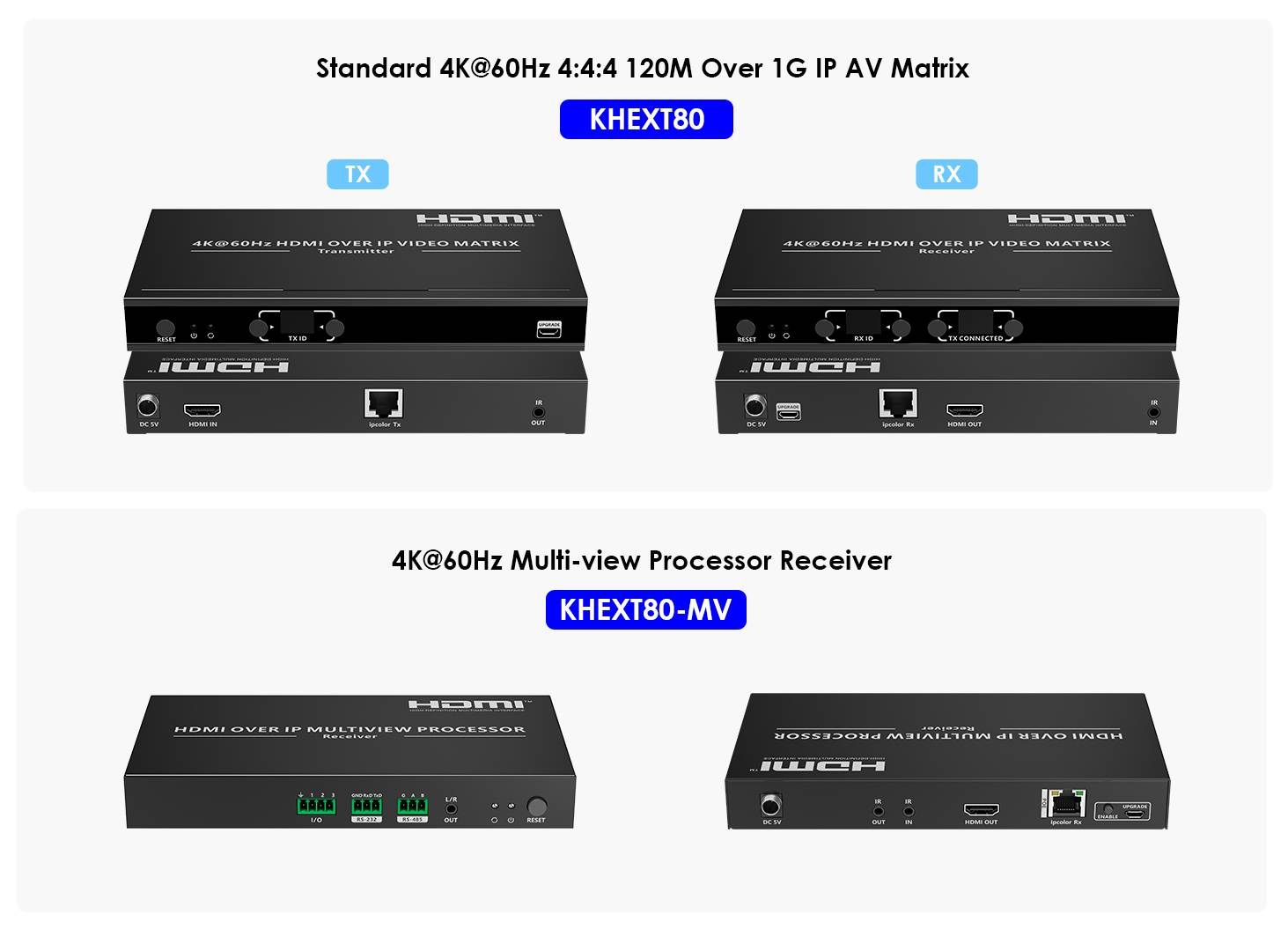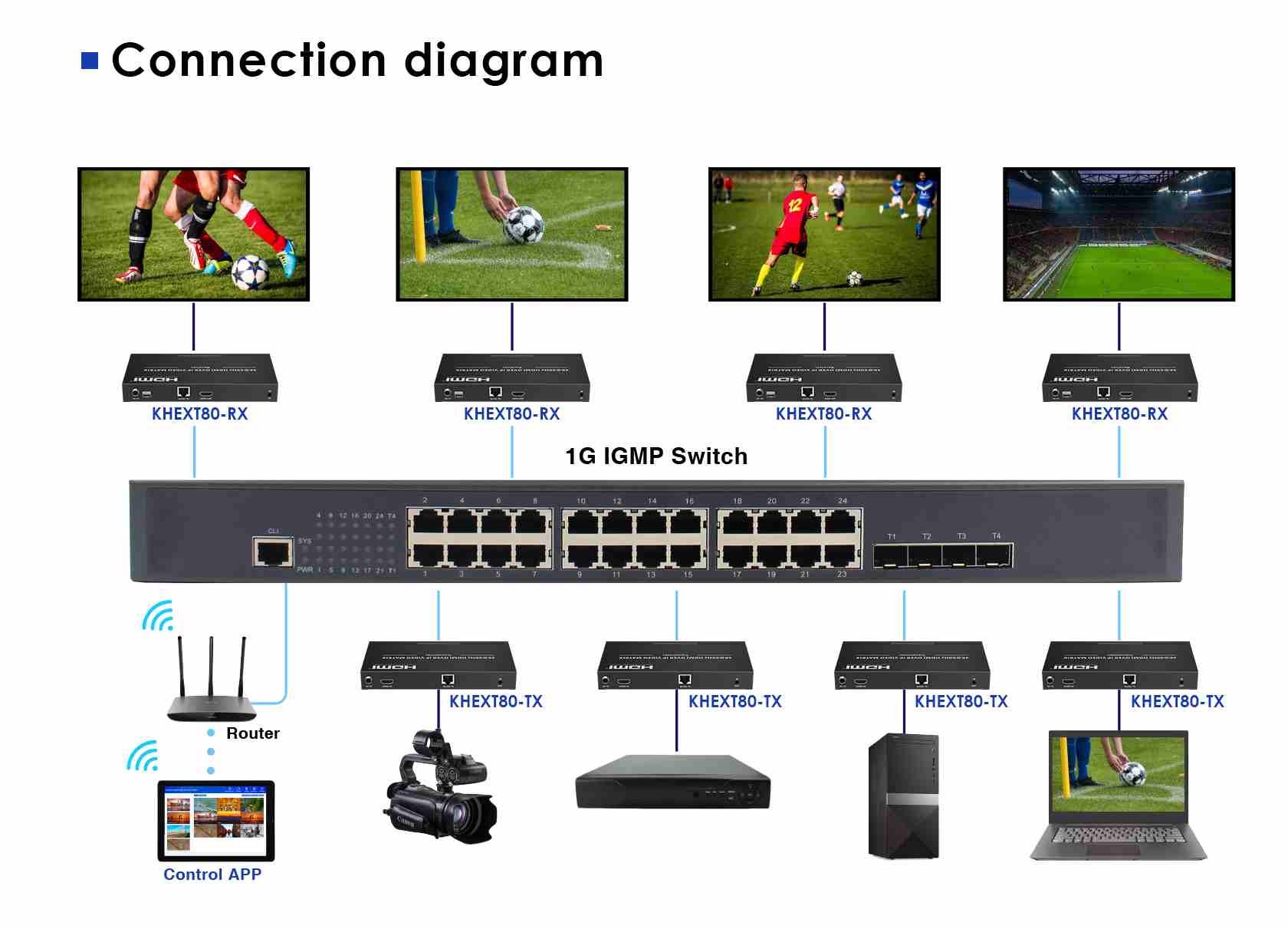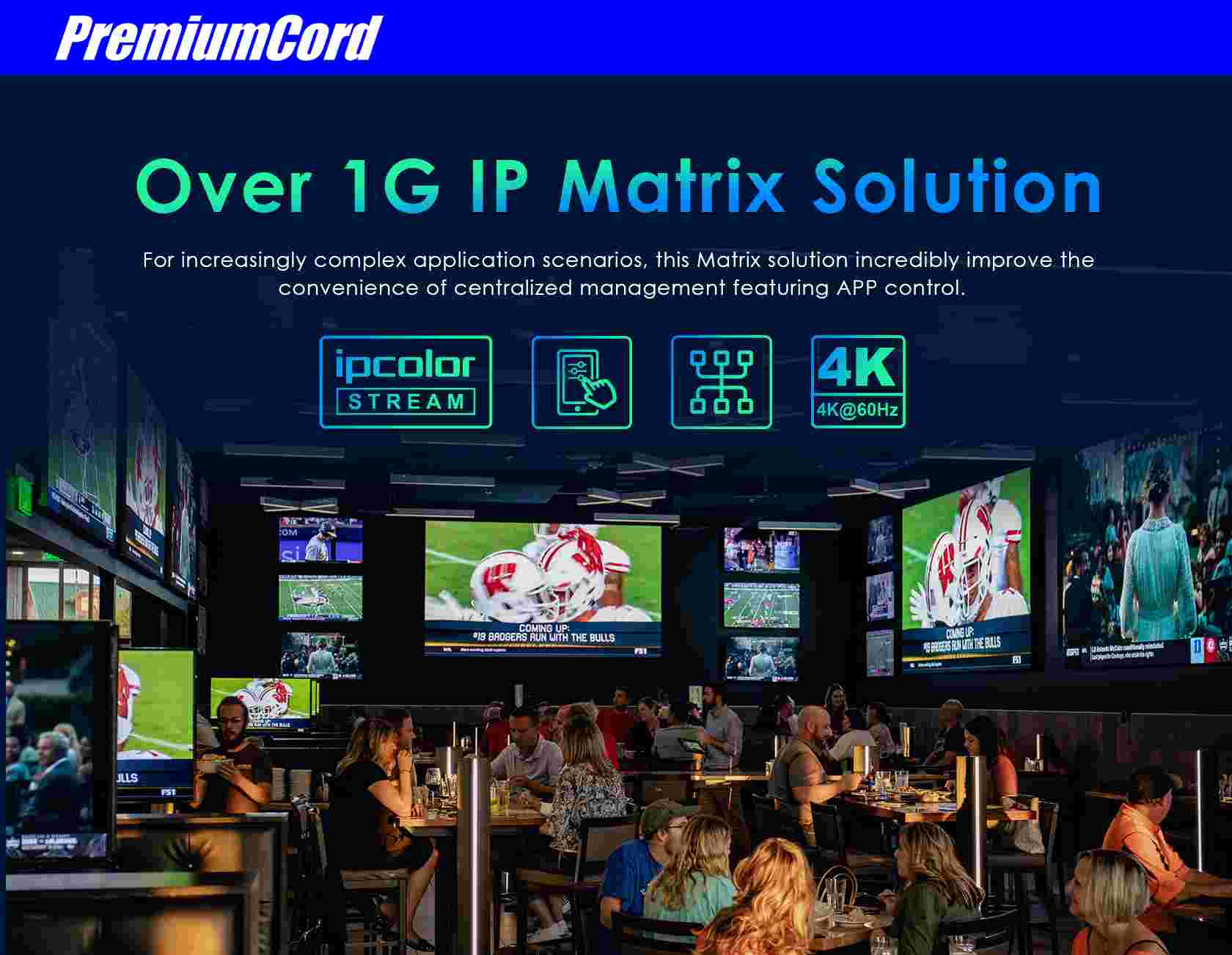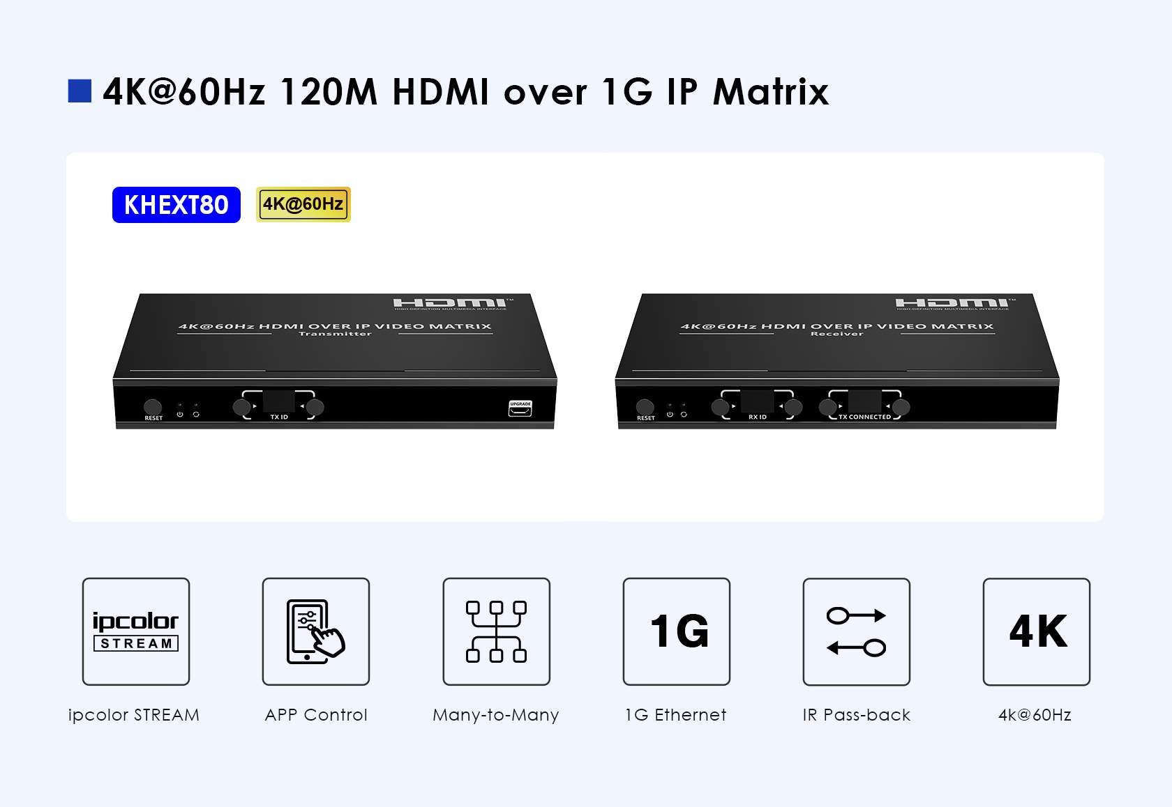 Zařízení umožňuje prostřednictvím 1G sítě propojit více zdrojů HDMI signálu a matricově zapojit více monitorů až na 120m. Matrici lze libovolně řídit a nastavovat pomocí APP.