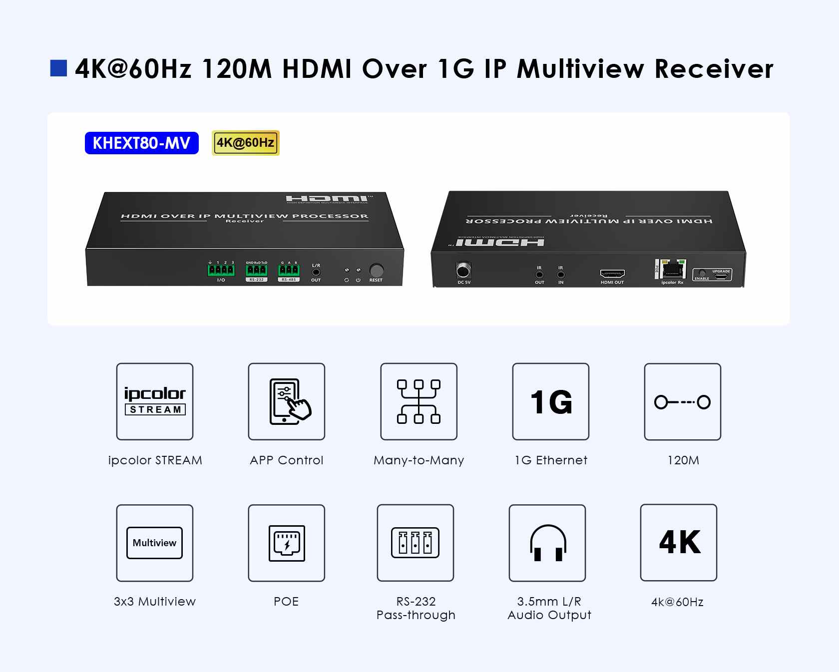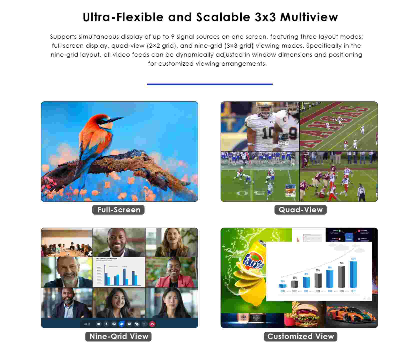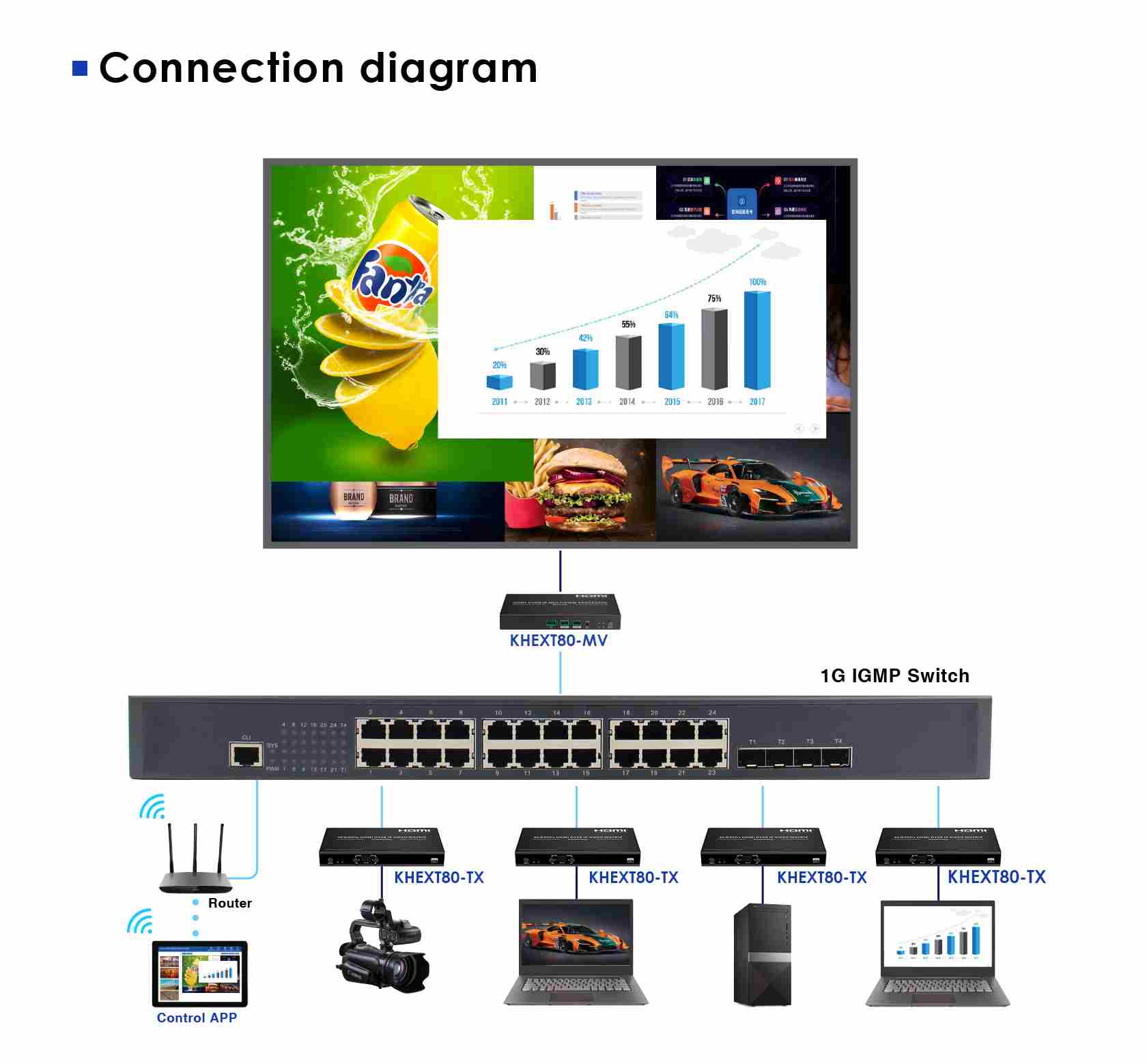 Zařízení umožňuje prostřednictvím 1G sítě propojit více zdrojů HDMI signálu a zobrazovat více obrazů najednou na jednom monitoru. Nastavování lze pomocí APP.