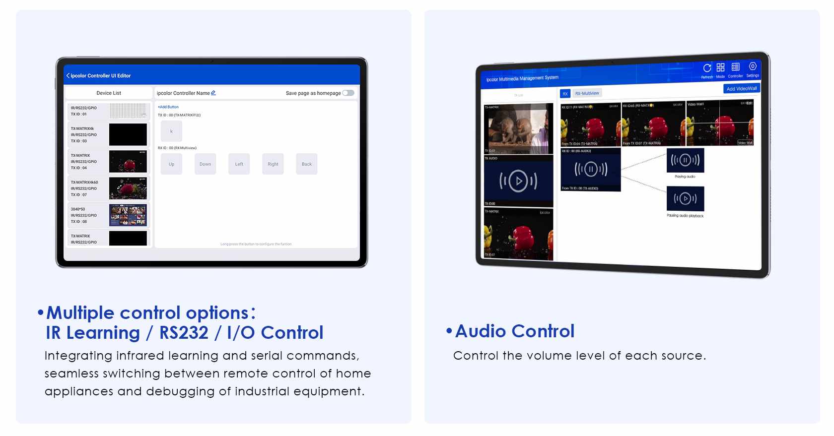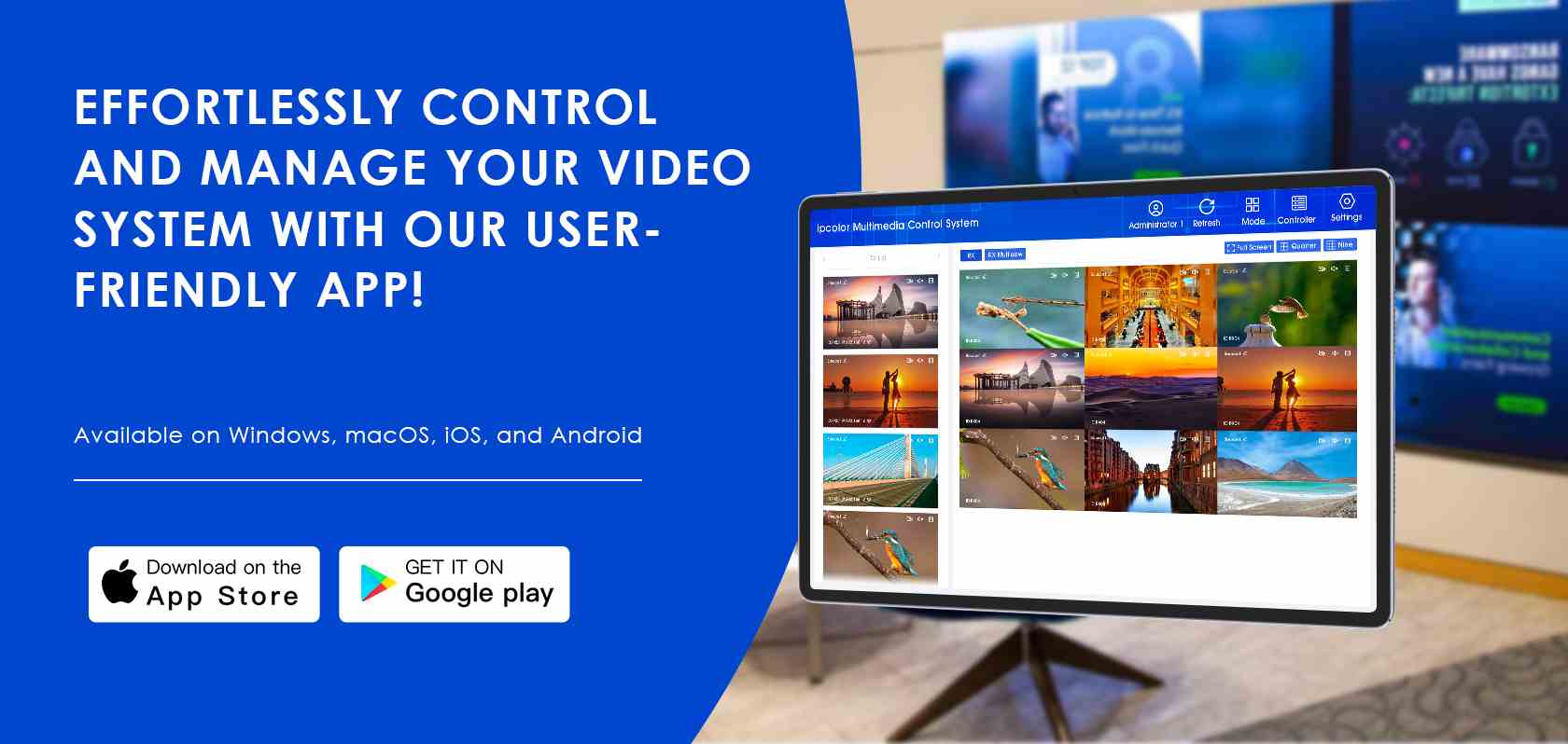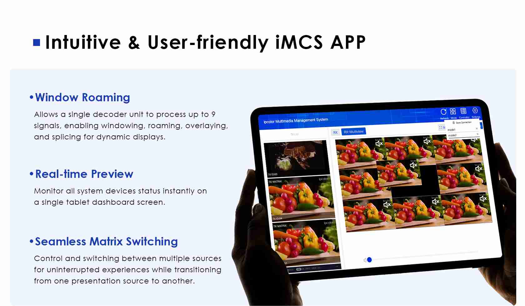 - Po připojení k matici iMCS over IP podporuje současný příjem a zpracování více signálů. Ve spojení s aplikací iMCS umožňuje dálkové ovládání zobrazení na obrazovce, zobrazení na čtyřech a devíti panelech a také úpravu velikosti a polohy zobrazení.