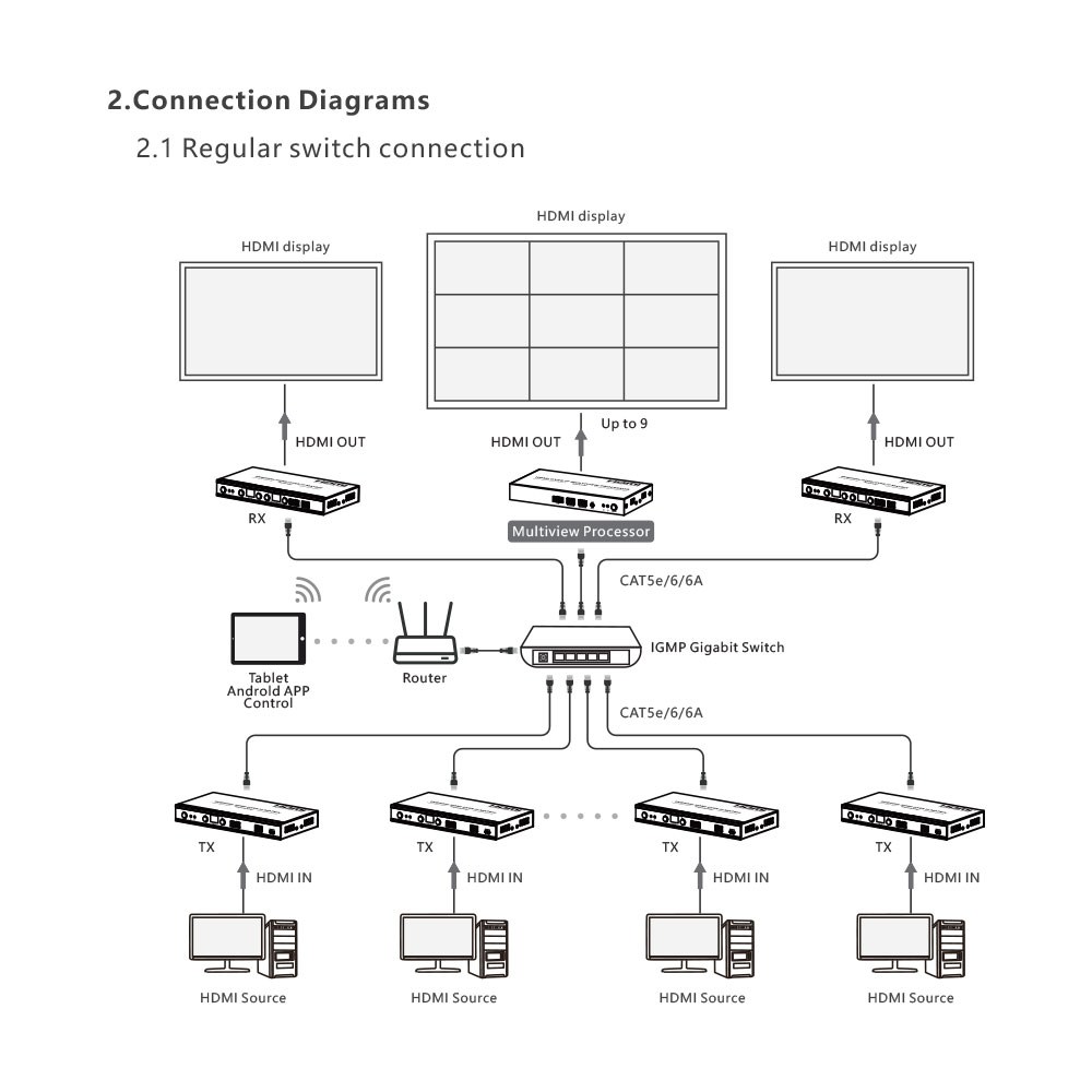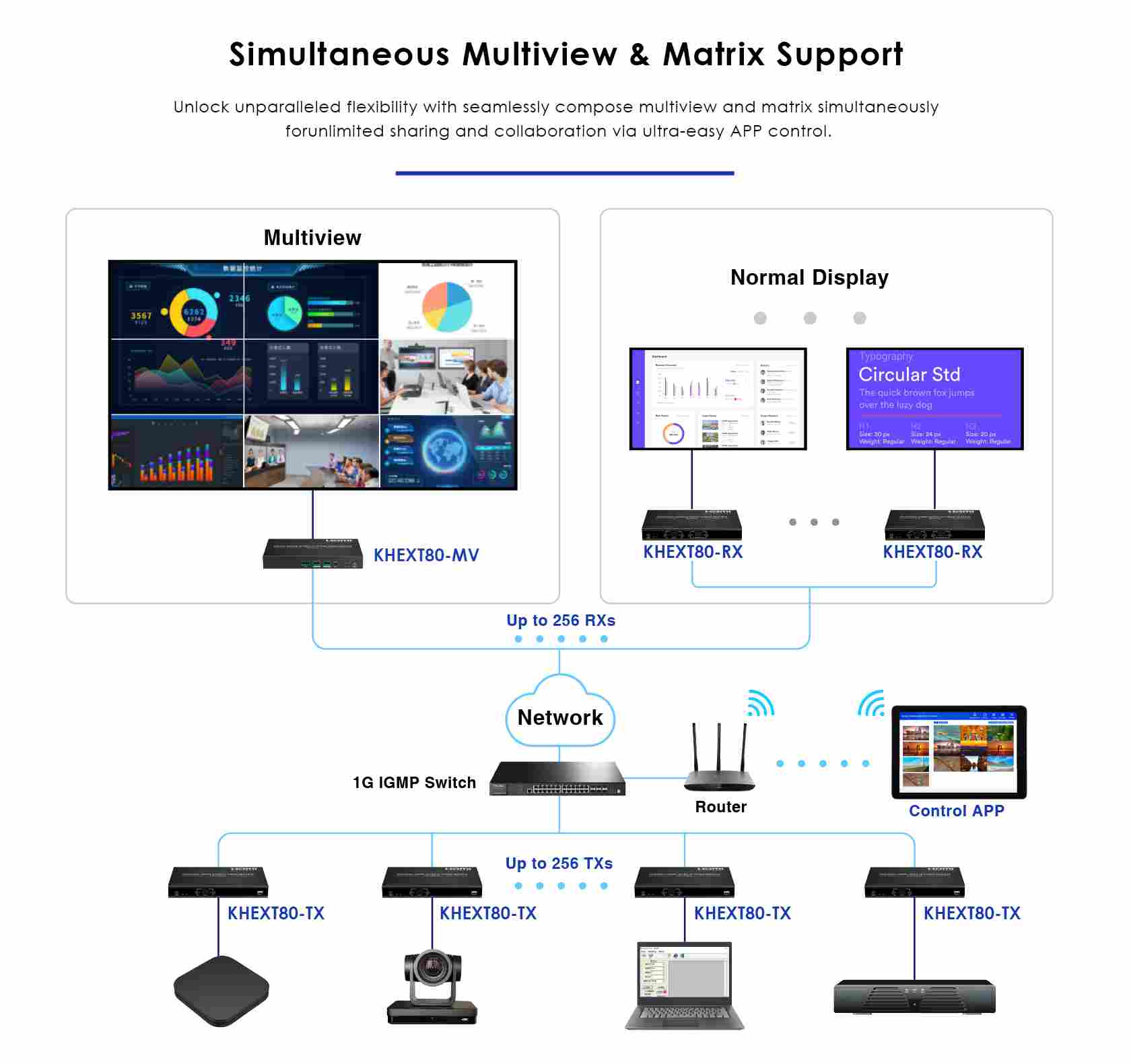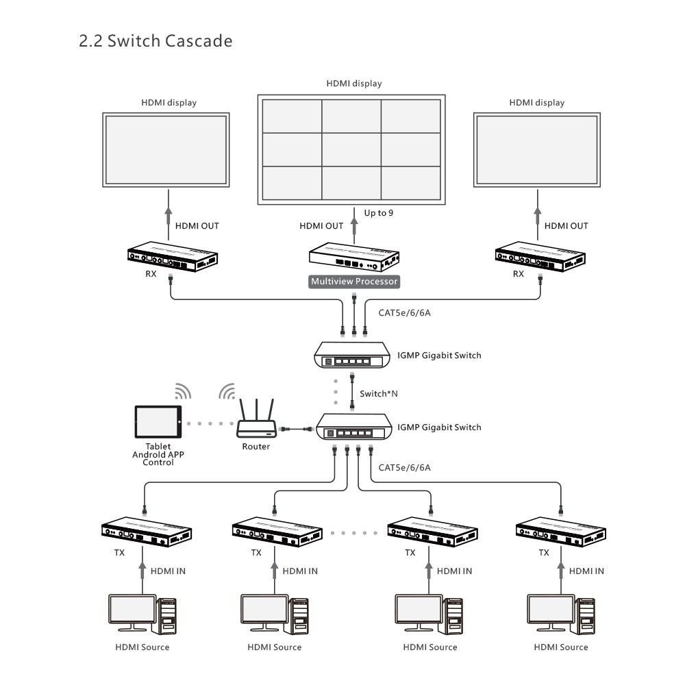 - Vytváření víceobrazovkového spojení s videostěnou až 5×5 (včetně také 1×1 / 1×2 / 1×3 / 1×4 / 1×5 / 2×1 / 2×2 / 2×3 / 2×4 / 2×5 / 3×1 / 3×2 / 3×3 / 3×4 / 3×5 / 4×1 / 4×2 / 4×3 / 4×4 / 4×5 / 5×1 / 5×2 / 5×3 / 5×4 / 5×5) pomocí přepínače a ovládané aplikací. Podporuje 256 vstupů signálových zdrojů a 256 výstupů signálu, což poskytuje flexibilní konfiguraci matice typu „mnoho k mnoha“ (při připojení více než 100 vysílačů a přijímačů vyžaduje ovládání pomocí aplikace).