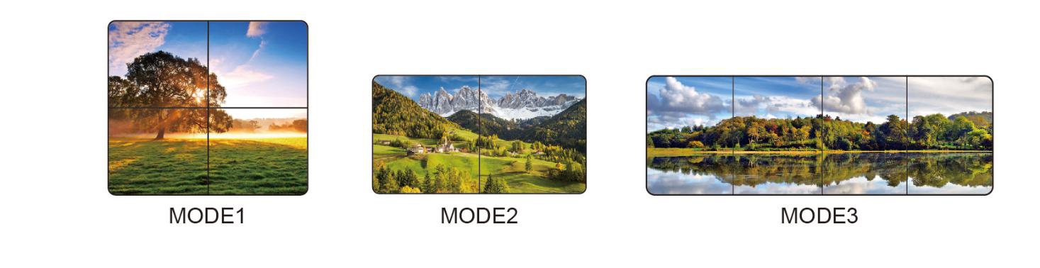 Jeden vstupní obraz , který může být 1080p nebo až 4K se přepočítá na výstupní signál FULL HD 1080p a rozdělí na čtyři čtvrtiny, které se zobrazí na čtyřech monitorech.