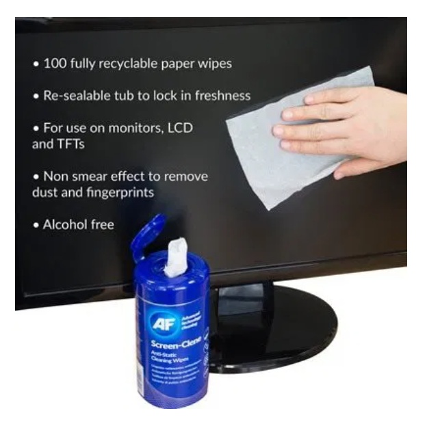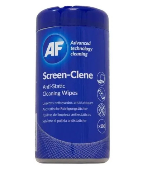 AF Screen-Clene – vlhčené ubrousky pro čištění LCD, LED, TFT a plazmových obrazovek. Jsou velmi šetrné k povrchům, nehořlavé, antistatické a příjemně parfémované.
