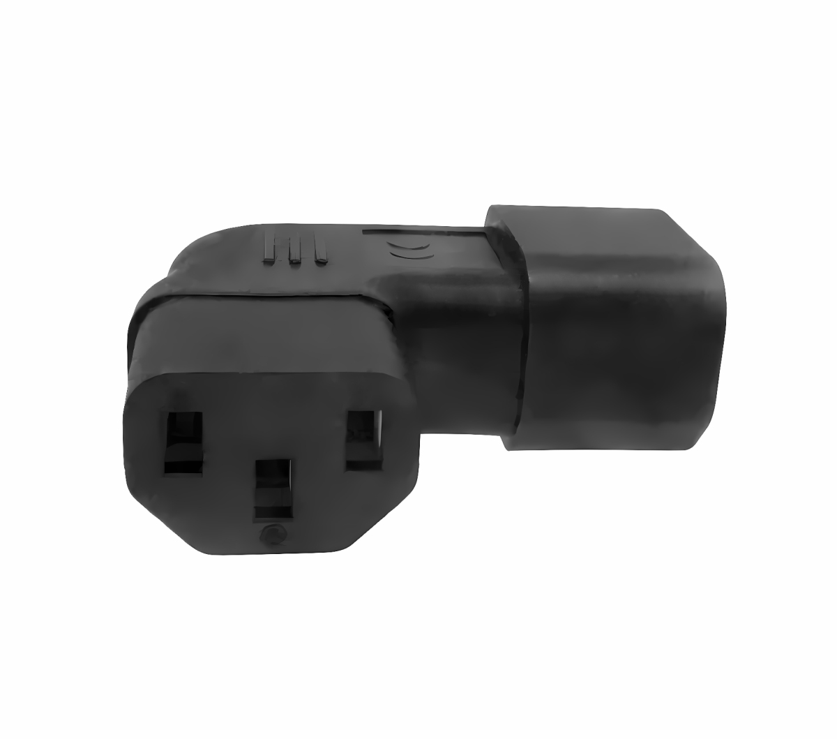 Adaptér úhlový IEC C13 female na IEC C14 male, napětí 230V, max.proud 10A, první konektor: IEC C13 zásuvka, druhý konektor: IEC C14 vidlice, vhodný pro zařízení, které jsou umístěny blízko stěny a není možné na zadní straně zapojit rovný napájecí kabel.