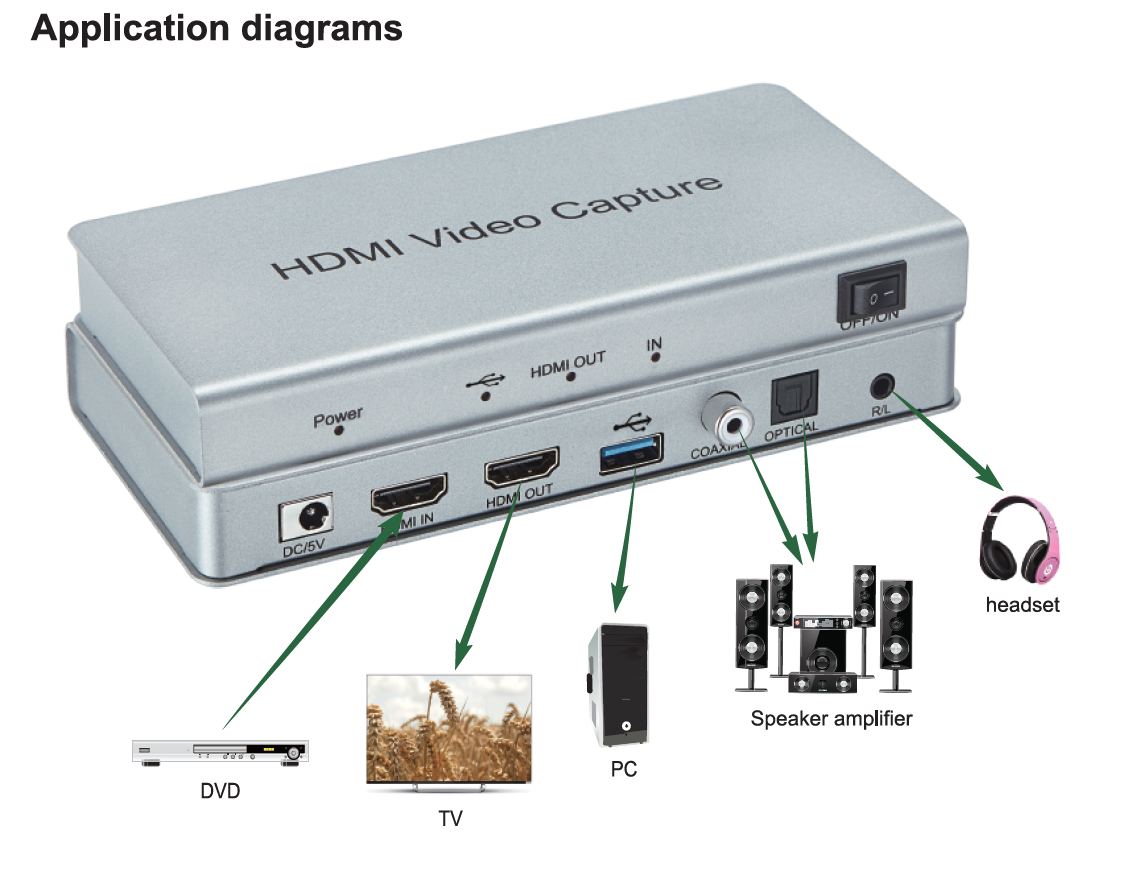 HDMI video capture dokáže také oddělit HD video a audio signál. Audio signál je na více výstupů pro zesilovač ( stereo jack, koaxiální nebo optický digitální ).