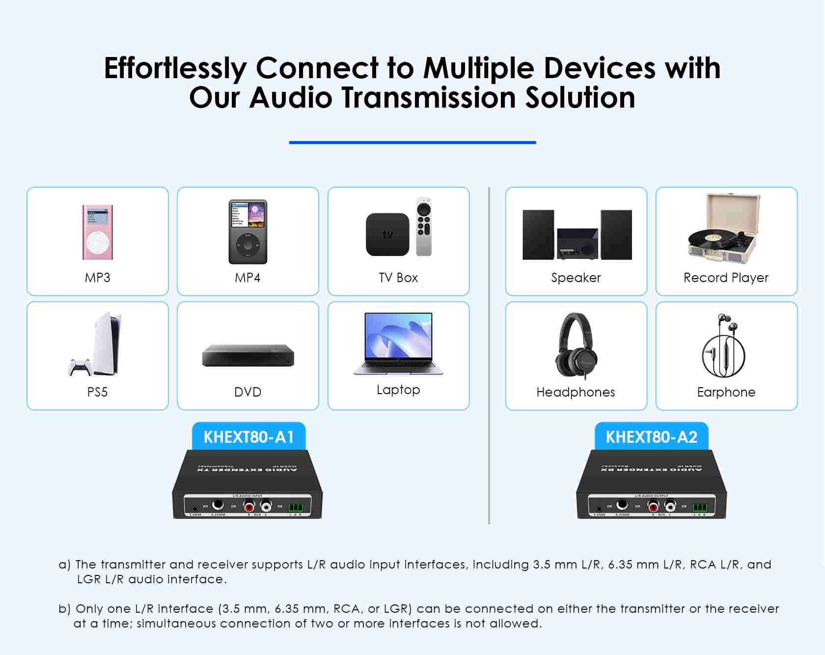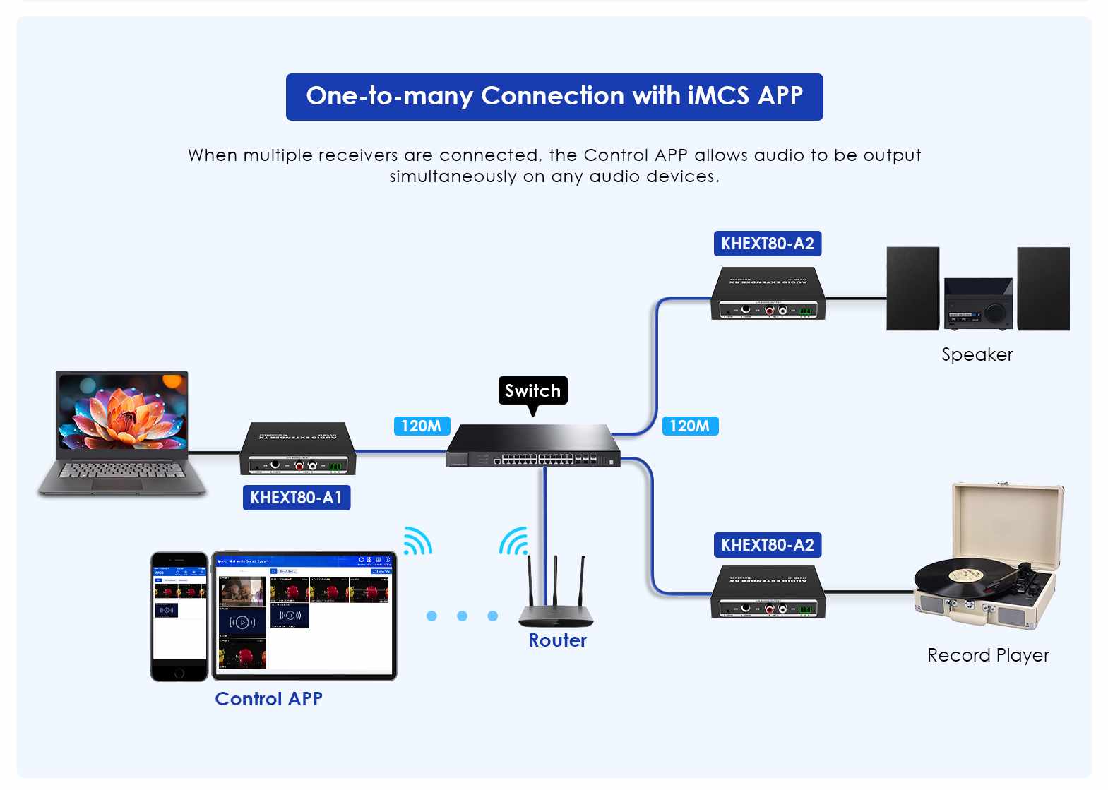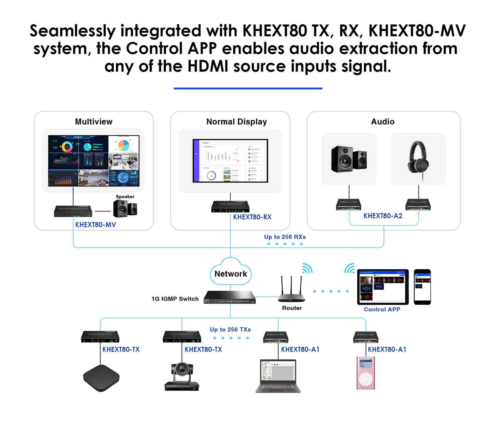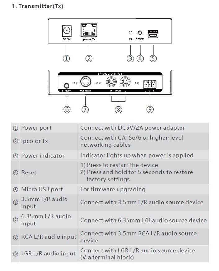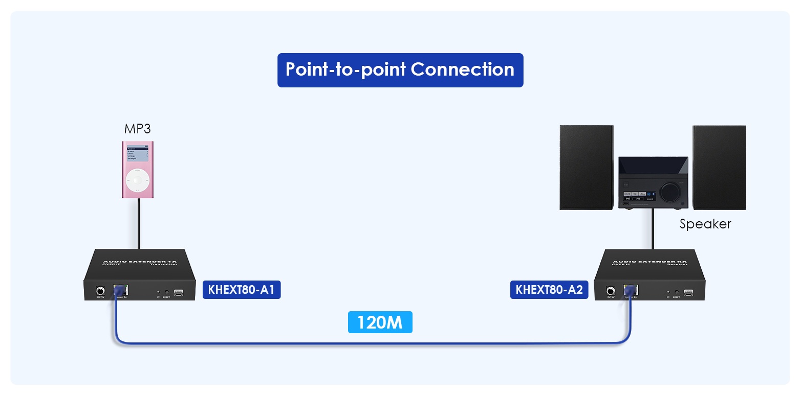 - Kompletní Audio extender se skládá z vysílače a přijímače. Po připojení k přepínači s podporou IGMP dokáže přepínat, rozšiřovat a distribuovat jeden audio signál napříč různými rozhraními.