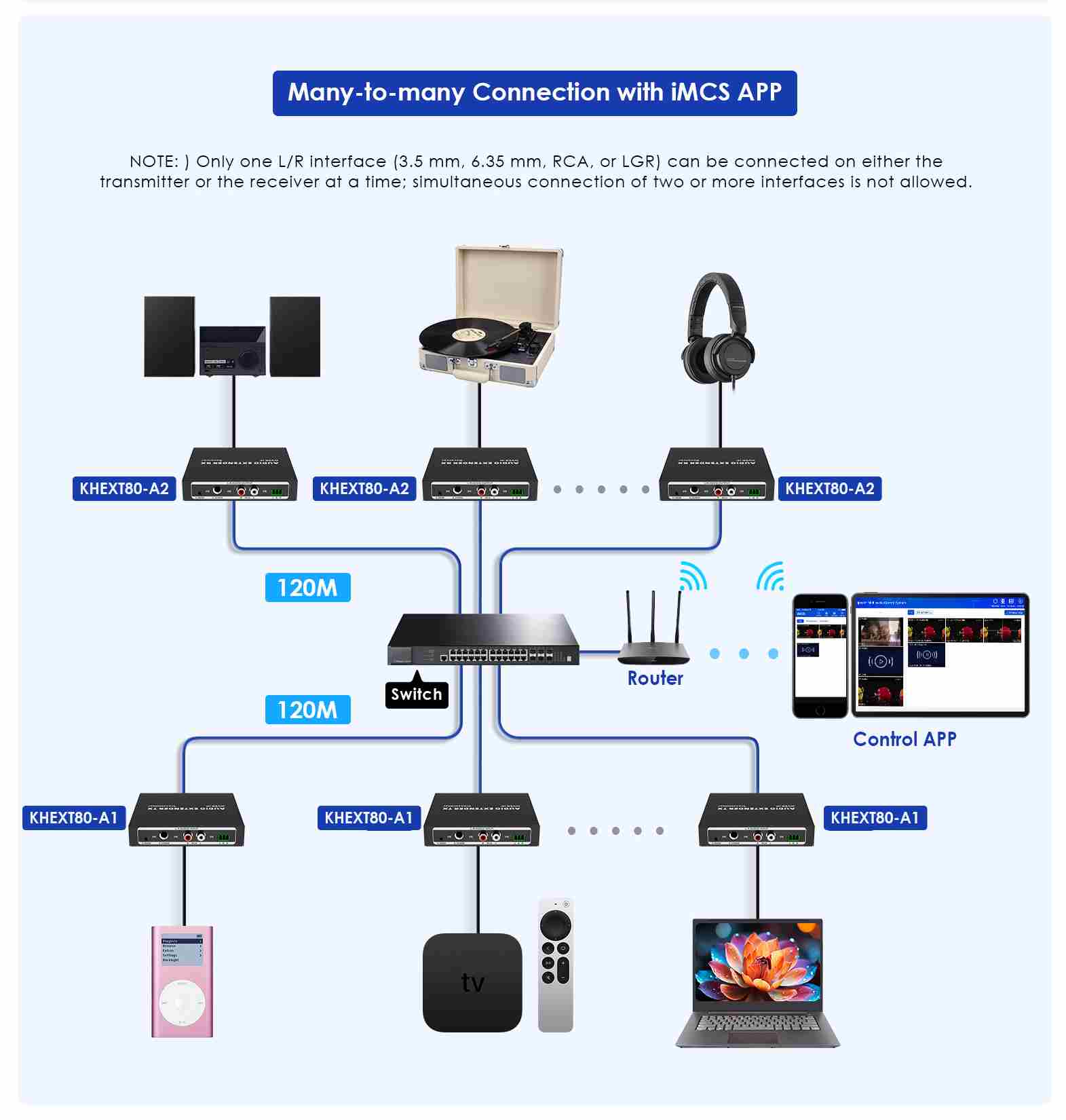 - Audio signály lze prodloužit až na 120 metrů pomocí CAT6/6A/7.
