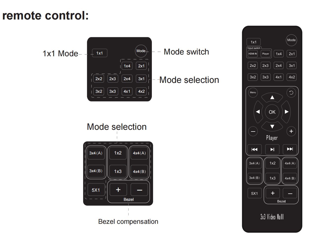 4K 3x3 controler videostěny podporuje 1x HDMI vstup a 9 HDMI výstupů. Hlavní funkcí je rozdělení kompletního HD obrazového signálu do 9 obrazů a jejich přiřazení na 9 LCD monitorů a vytvoření jedné velké video stěny. Umožňuje zapojit až 9 HDMI monitorů a vytvořit velkou dynamickou obrazovou plochu. Jako ovladač videostěny podporuje zobrazení jednoho kompletního HD obrazu s více režimy (až 13 režimů viz přiložené příklady), dokonale vytváří videostěnu bez nutnosti použití ovládacího softwaru, je plug and play a snadno se ovládá pomocí IR ovladače. Je široce používán pro reklamní obrazovky, restaurace, výuku atd.