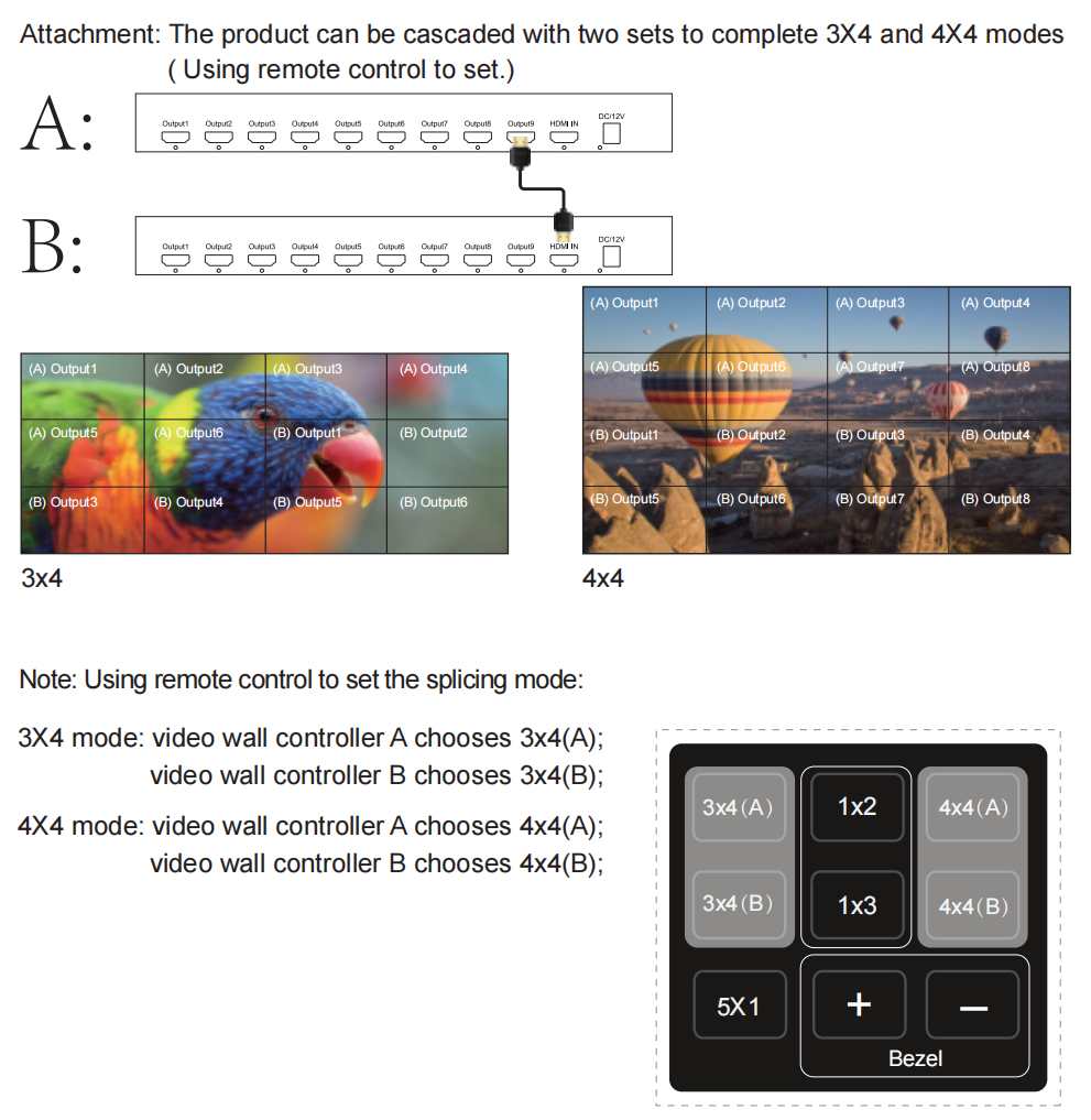 Umožňuje zapojit až 9 HDMI monitorů a vytvořit velkou dynamickou obrazovou plochu. Jako ovladač videostěny podporuje zobrazení jednoho kompletního HD obrazu s více režimy (až 13 režimů viz přiložené příklady), dokonale vytváří videostěnu bez nutnosti použití ovládacího softwaru, je plug and play a snadno se ovládá pomocí IR ovladače.
