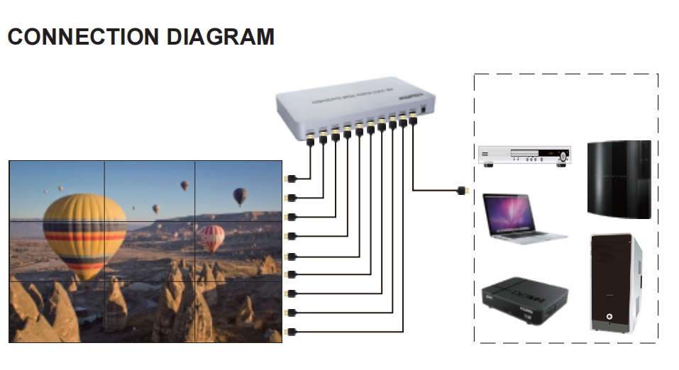 Umožňuje zapojit až 9 HDMI monitorů a vytvořit velkou dynamickou obrazovou plochu. Jako ovladač videostěny podporuje zobrazení jednoho kompletního HD obrazu s více režimy (až 13 režimů viz přiložené příklady), dokonale vytváří videostěnu bez nutnosti použití ovládacího softwaru, je plug and play a snadno se ovládá pomocí IR ovladače.