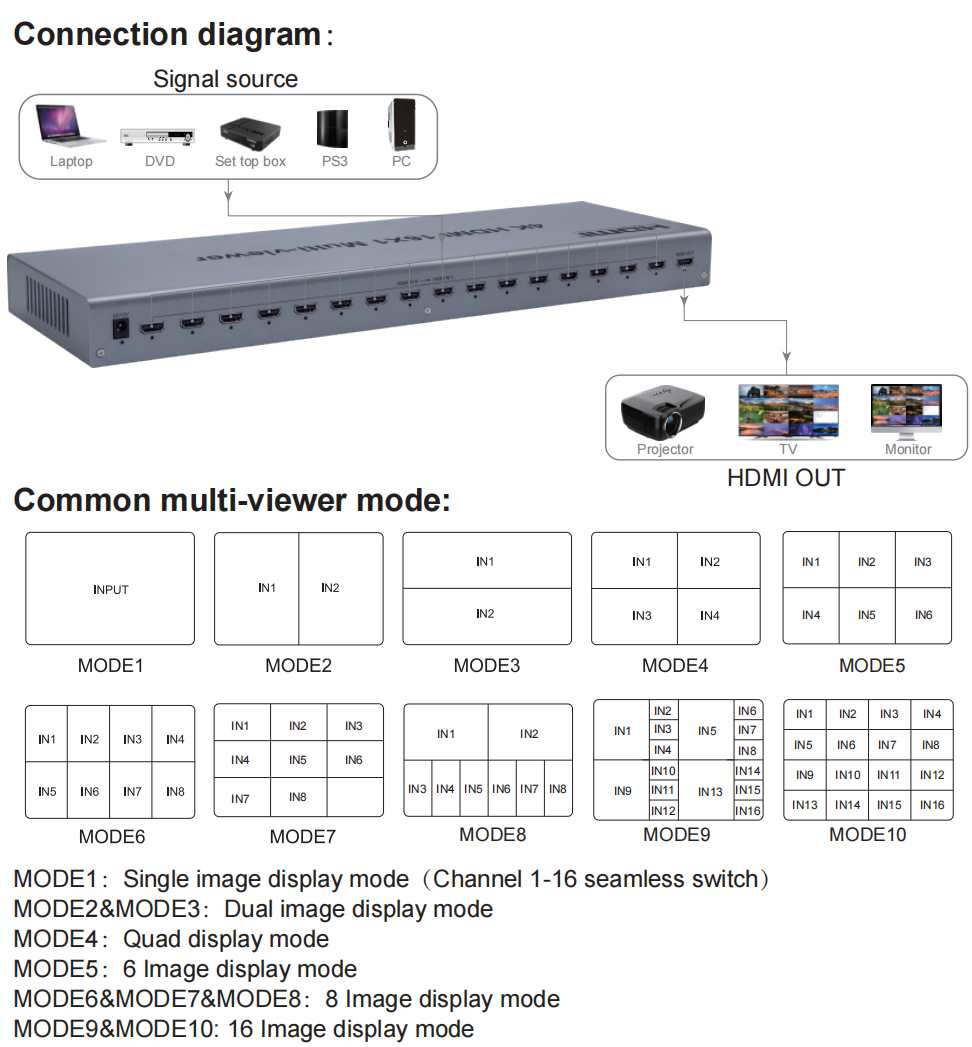- Umožňuje zobrazit 16 HDMI signálů na jeden výstup HDMI. - Deset zobrazovacích módů viz fotografie - Umožňuje až 16 HDMI obrazů zobrazit v segmentech na jedné obrazovce. (Video Wall) - Dokáže jednoduše přepínat mezi 16 HDMI signály za pomoci tlačítka nebo dálkového ovládání. - 16 vstupních HDMI konektorů - 1 výstupní HDMI konektor . Vstup - nejvyšší rozlišení až 1080p @ 60Hz 720p 1024x768, 1360x768 - Výstup - nejvyšší rozlišení 4K, 1080p FULL HD - Ovládání IR nebo tlačítkem na čelním panelu - Dálkové ovládání má tlačítka se symboly , představující jednotlivé módy zobrazení - Kompatibilní HDMI1.4, HDCP1.4, vstup kompatibilní DVI1.0 - Vstup podporuje rozlišení: 1080P, 720P, 1080i, 1024X768,1360X768 - Podporuje audio výstupní formát: PCM2, 5.1CH, 7.1CH, Dolby5.1, DTS5.1 - Umožňuje použít až 15m kabel s vodiči AWG26 na vstupu i na výstupu - Obsahuje napáječ DC12V / 2A - Pracovní teplota: -15°C do +55°C - Rozměry: 460x150x40 mm - Váha:1,7kg
