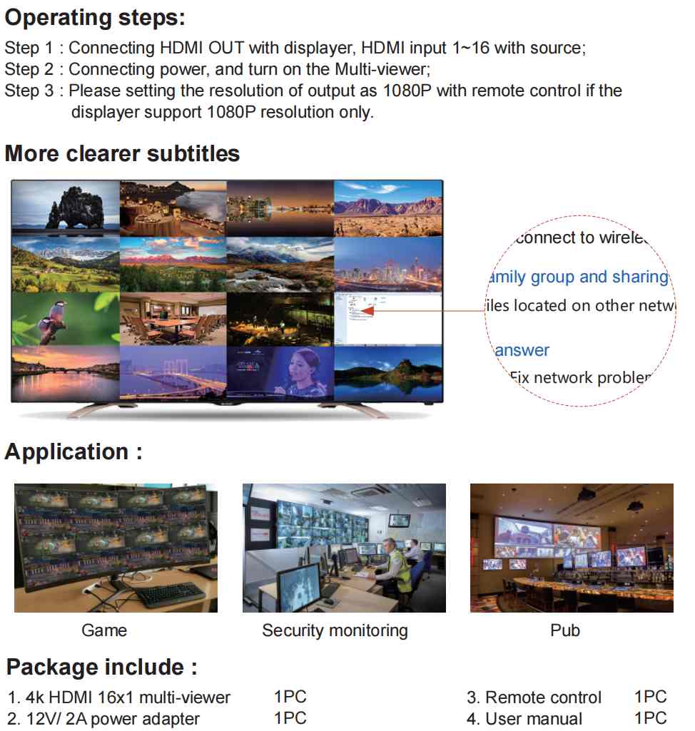 - Umožňuje zobrazit 16 HDMI signálů na jeden výstup HDMI.