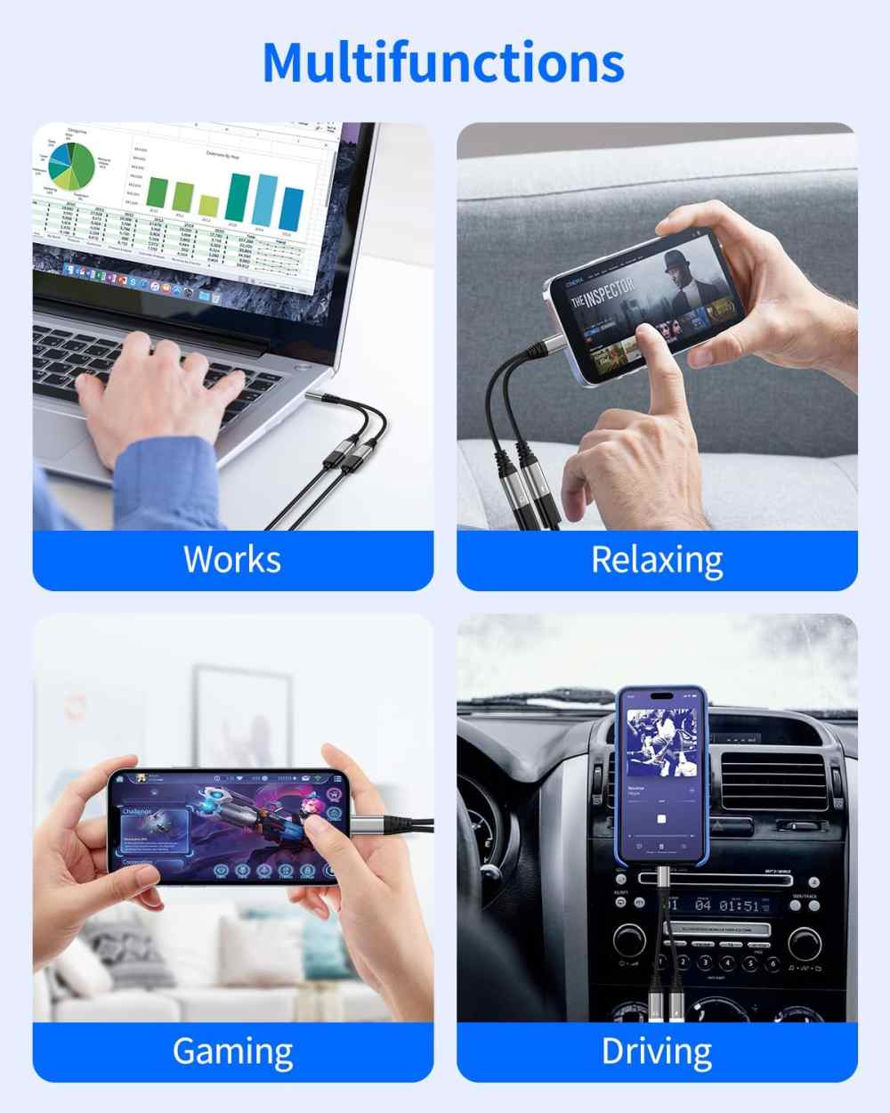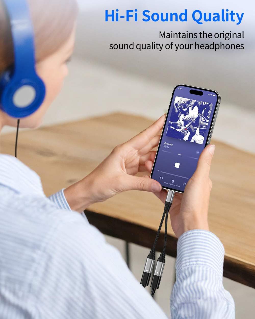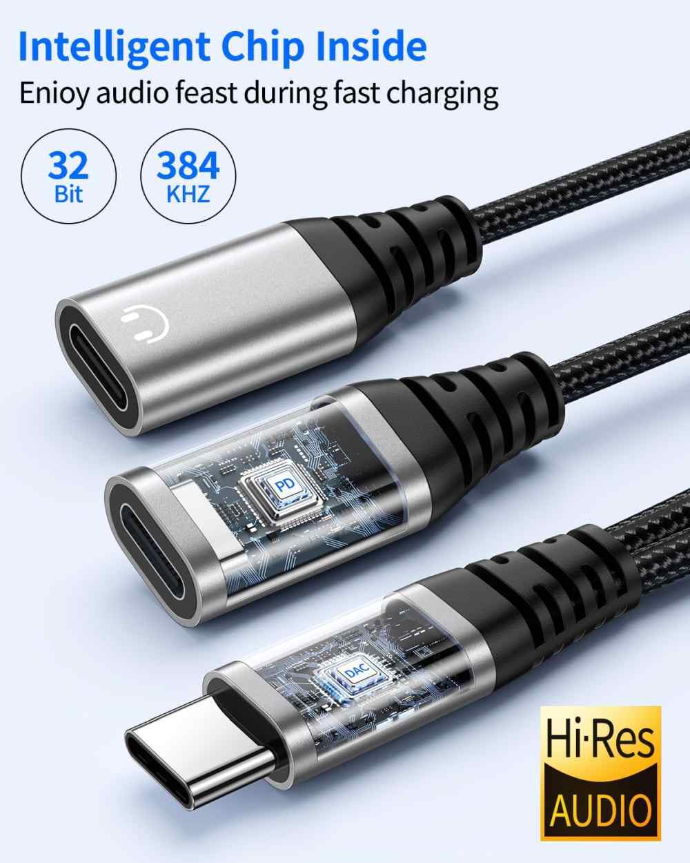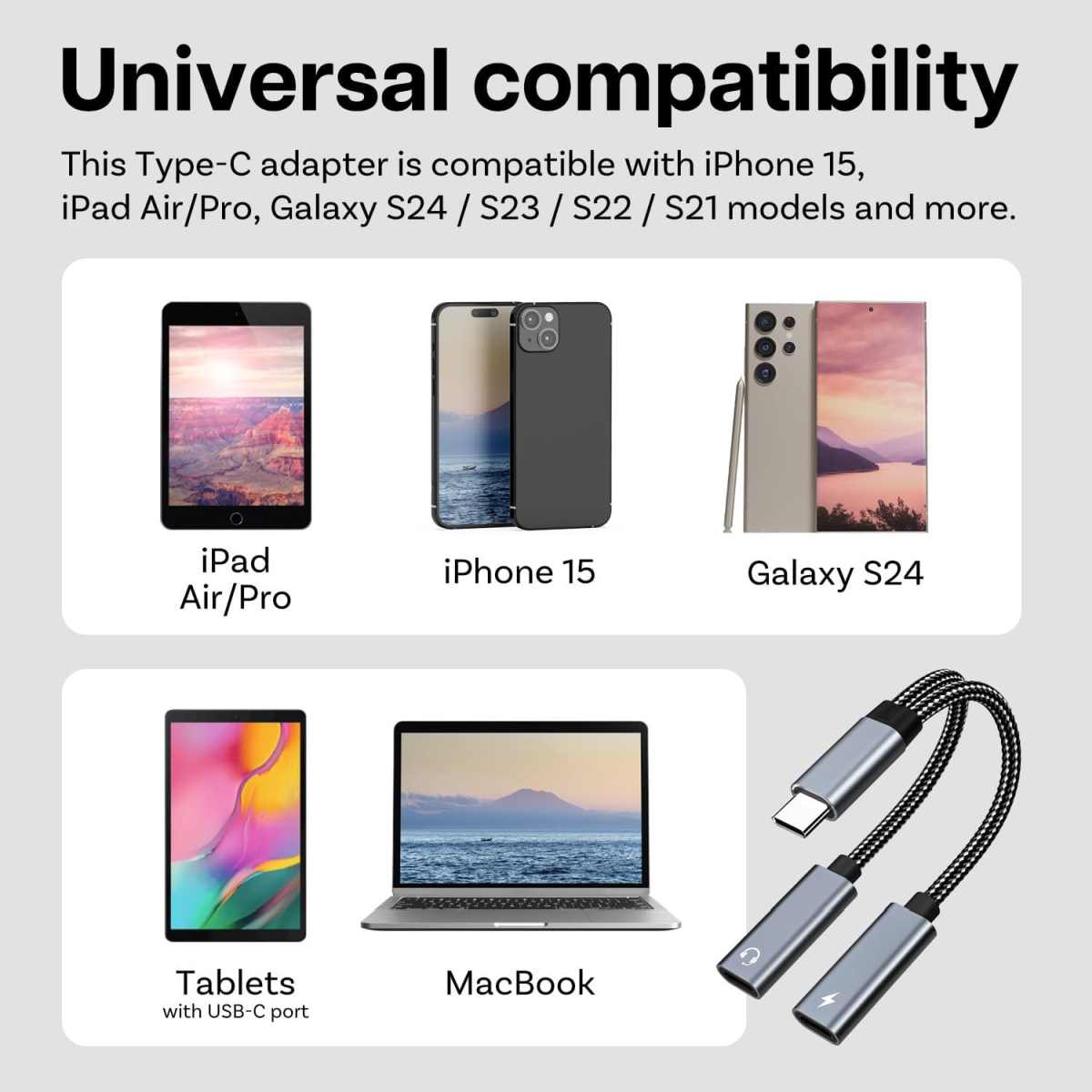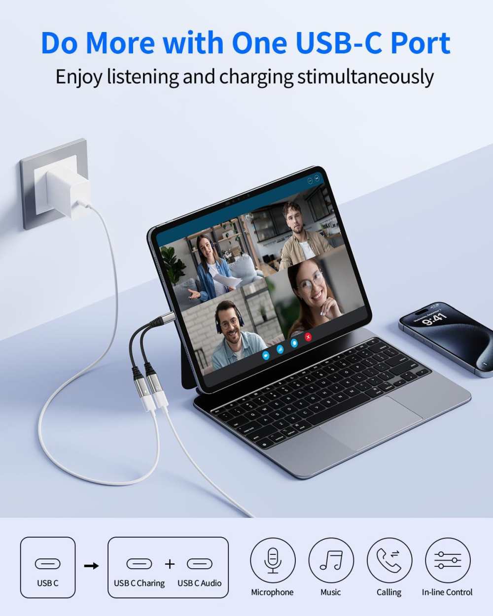 Proměňte svůj zvukový a nabíjecí zážitek s rozbočovačem USB-C. Tento adaptér 2 v 1 umožňuje současně připojit sluchátka a nabíjet zařízení, což z něj činí ideálního společníka pro vaše zařízení s USB-C.