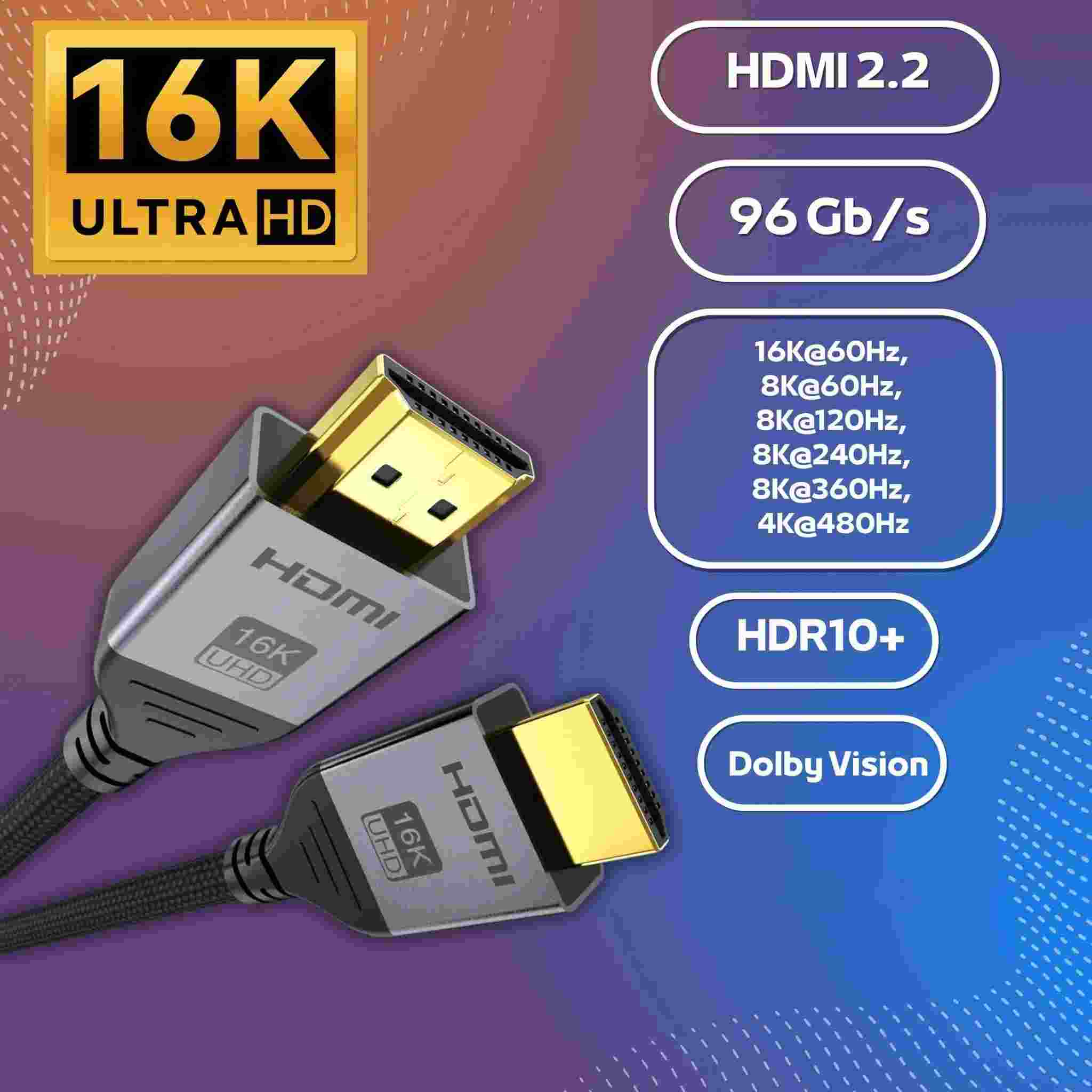 Špičkový ULTRA HDMI 2.2 propojovací kabel pro nejvyšší rozlišení16K@60Hz, 8K@240Hz, 4K@480Hz s kovovými Aluminium alloy koncovkami, pozlacenými konektory, flexibilním kabelem pro nejnáročnější použití. Kabel je vícenásobně stíněný, dokáže přenášet digitální zvuk i obraz a podporuje digitání ochranu obsahu HDCP. Nově vylepšený 16K HDMI kabel: Inovativní vylepšený 16K HDMI kabel s podporou vysokorychlostního přenosu 96 Gb/s umožňuje plynulé přechody mezi rozlišeními 16K při 60 Hz, 8K při 120 Hz a 4K při 480 Hz pro křišťálově čistý obraz.